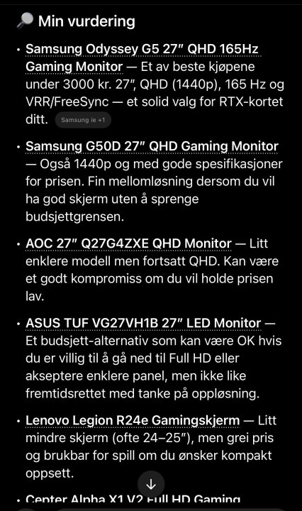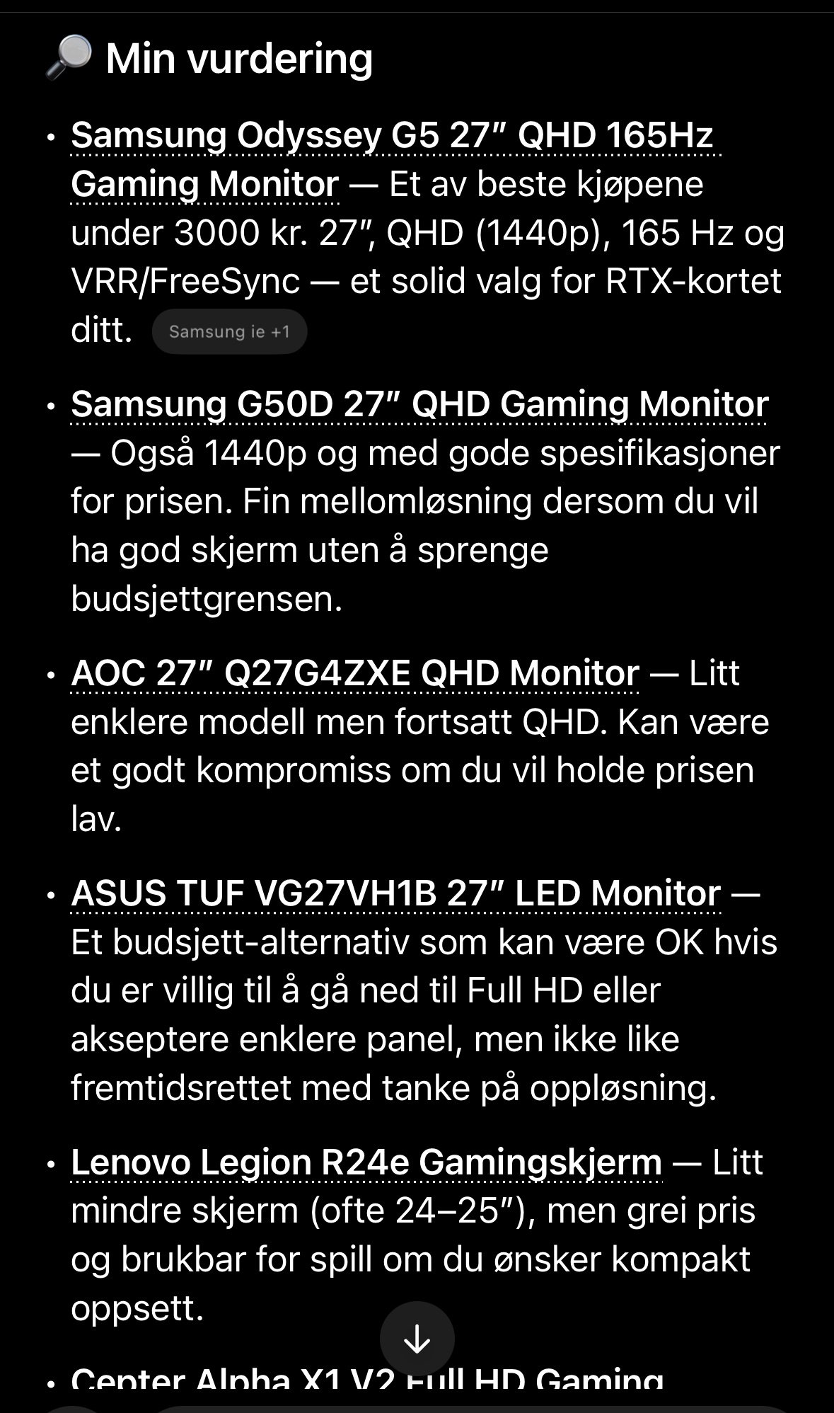 Jeg glemte å takk for hjelpen. Det ble 5060 korte med 16gb. Mottaker ble veldig fornøyd og selger (ung) hos Elkjøp der jeg hentet varen ble misunnelig. Vet ikke hva det betyr, men virker som et bra kjøp. Skal nå kjøpe skjerm 😊 ChatGPT anbefaler disse: