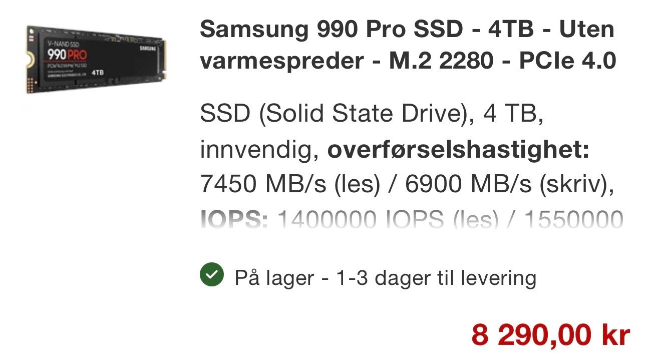 Kjøpte disse to i Januar, da fikk jeg 990 4TB til 4500 og 870 4TB til 4100. At det har doblet seg på 2 mnd er ganske sykt. Har to stykk 990 liggende fra forrige PCen, spørsmålet er, selger jeg de nå, eller kan det hende prisene stiger ennå litt mer?