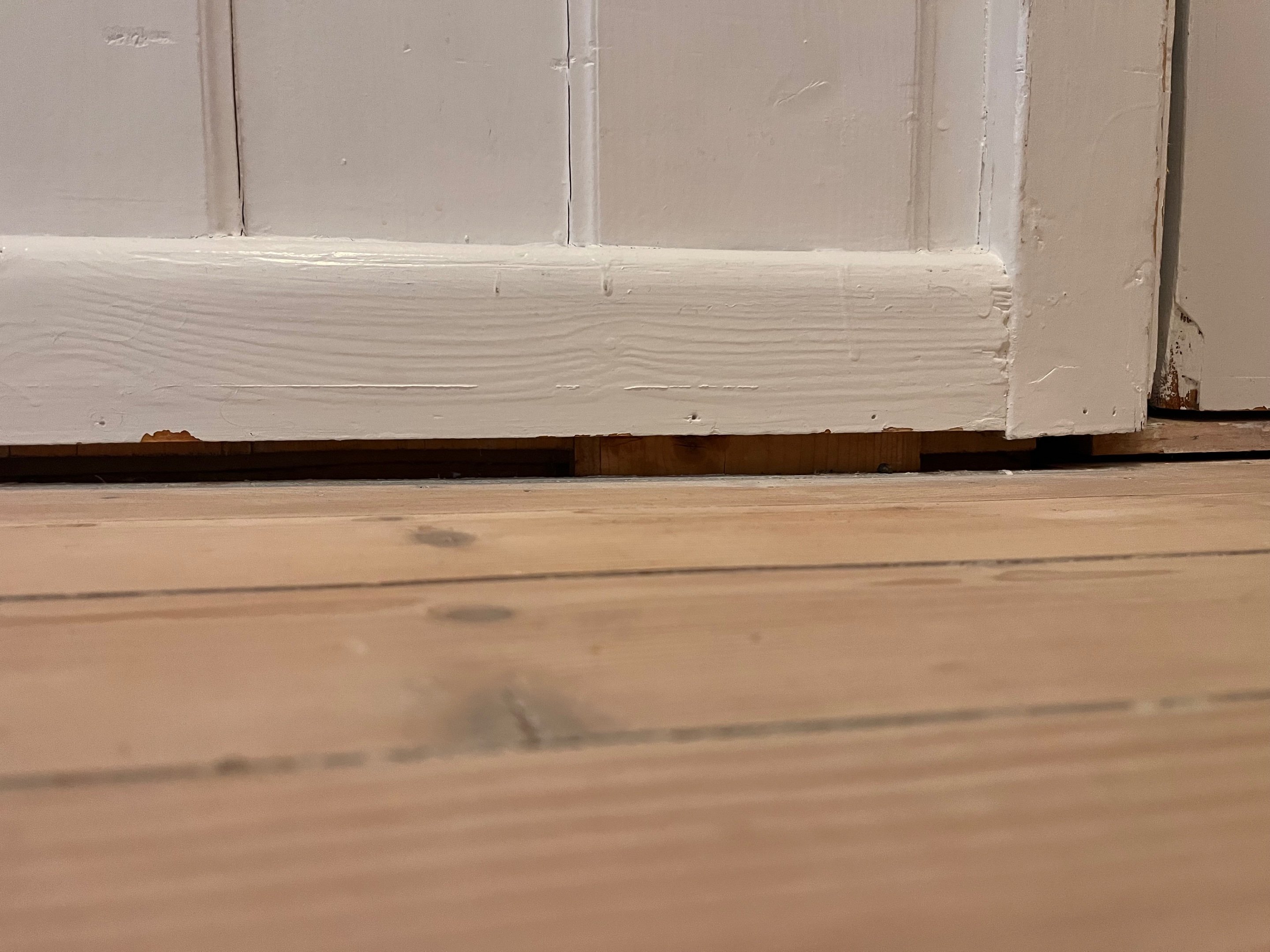 Hei! Jeg har et femtitallshus, der det har sett slik ut mellom gulv og list i gangen i 2.etasje siden jeg kjøpte huset for 11 år siden. Det er en dør til høyre, der også dørramma har store glipper. Men jeg skjønner ikke helt hvorfor, og ikke hva jeg kan gjøre for at det skal se penere ut. Det synes ingenting i taket nede i første. Jeg kommer ikke til å ta opp gulvet 😅 Men siden glippen skråner så mye og er så stor blir vaskelist også rart? Eller? Det samme har skjedd på den andre siden av pipa på samme vegg (på en måte, den går på langs tvers gjennom 2. etasje). Jeg får ikke bildene til å havne rett vei, men satser på at de gir mening likevel. Håper på gode råd!