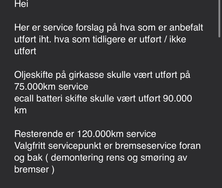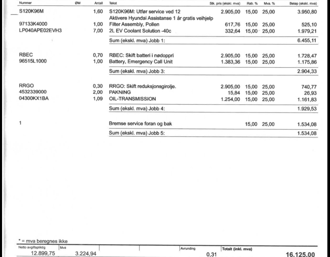 Takker for input! Se vedlegg for pristilbud 120k service + noe ekstra for 16.125 kr. Fikk tilbud fra NAF nå med tilsvarende, ble 12900. Medlemskap så blir det 11610 kr. Tenker det mest fornuftige da er å gå for denne, siden NAF er velrenommert og ønsker godkjent servicehistorikk. Har dessverre ikke kapasitet til å dra utenlands om dagen for å gjøre det, men godt tips. For en lite kyndg; hvordan gjøres dette med serviceoppfølging normalt (/optimalt)? Kan man be om tilbud fra Sulland hvert år og så gjøre jobben andre steder? Det fremstår jo som litt lunken stemning, kan jeg tenke meg. Vil heller ikke risikere gjøre alt hos noen andre, hvis jeg da risikerer å gå glipp av viktige servicepunkter som andre ikke tar med pga de ikke følger det korrekte serviceprogrammet. Synes det er vanskelig å få en god oversikt over hva som er vanlig «sjekk og pleie / vedlikehold av enkle komponenter», og hva som er ekstra og viktig som kommer ved gitte kilometerintervaller, som potensielt glipper hos andre enn Hyundai.