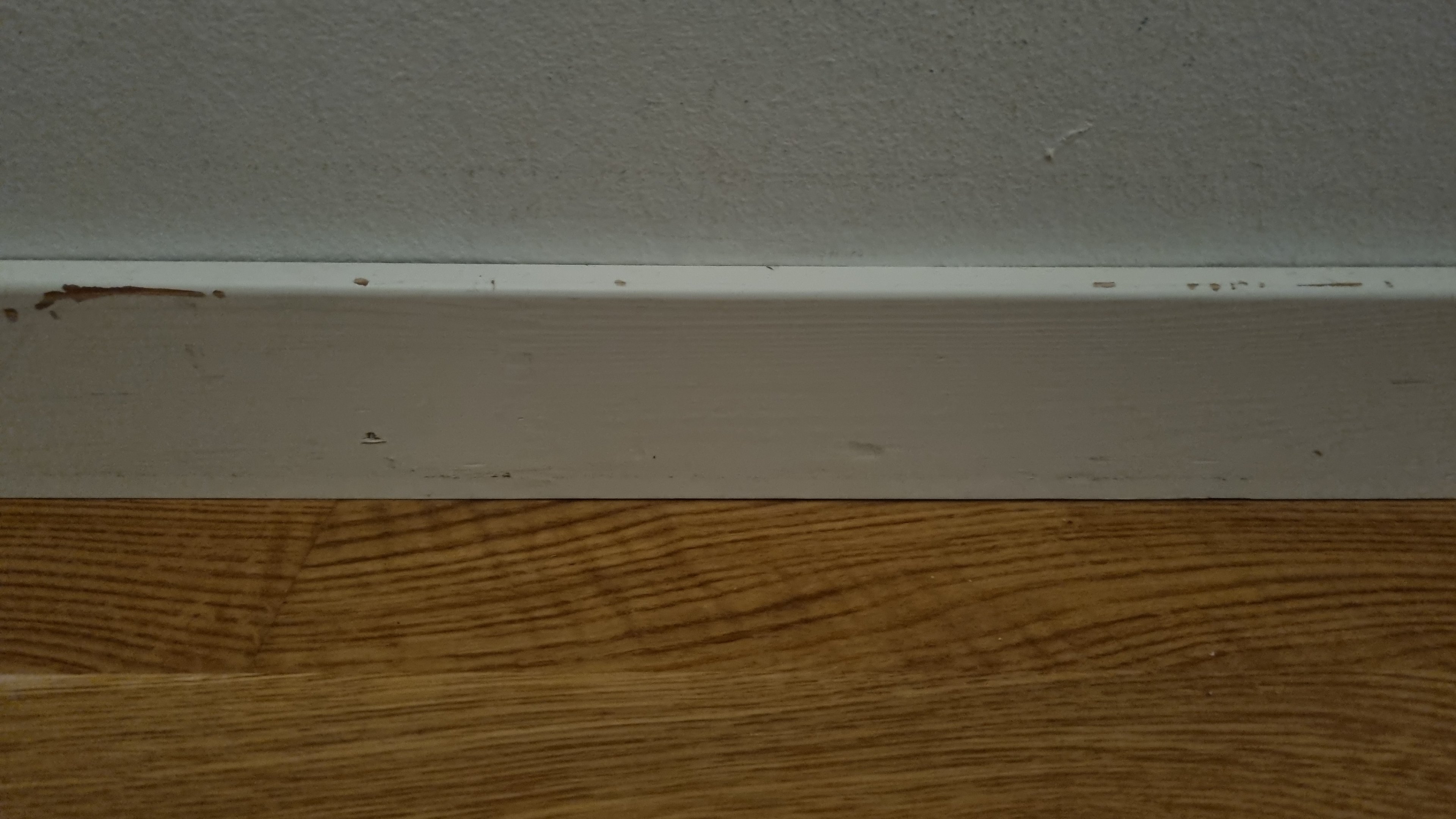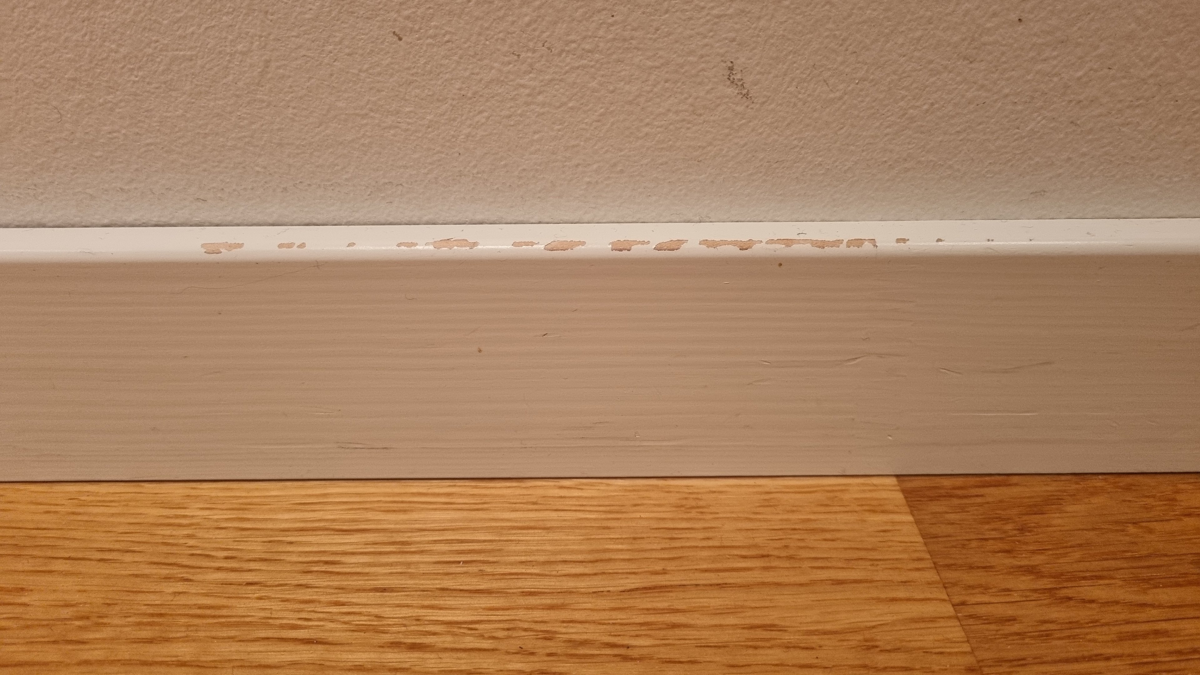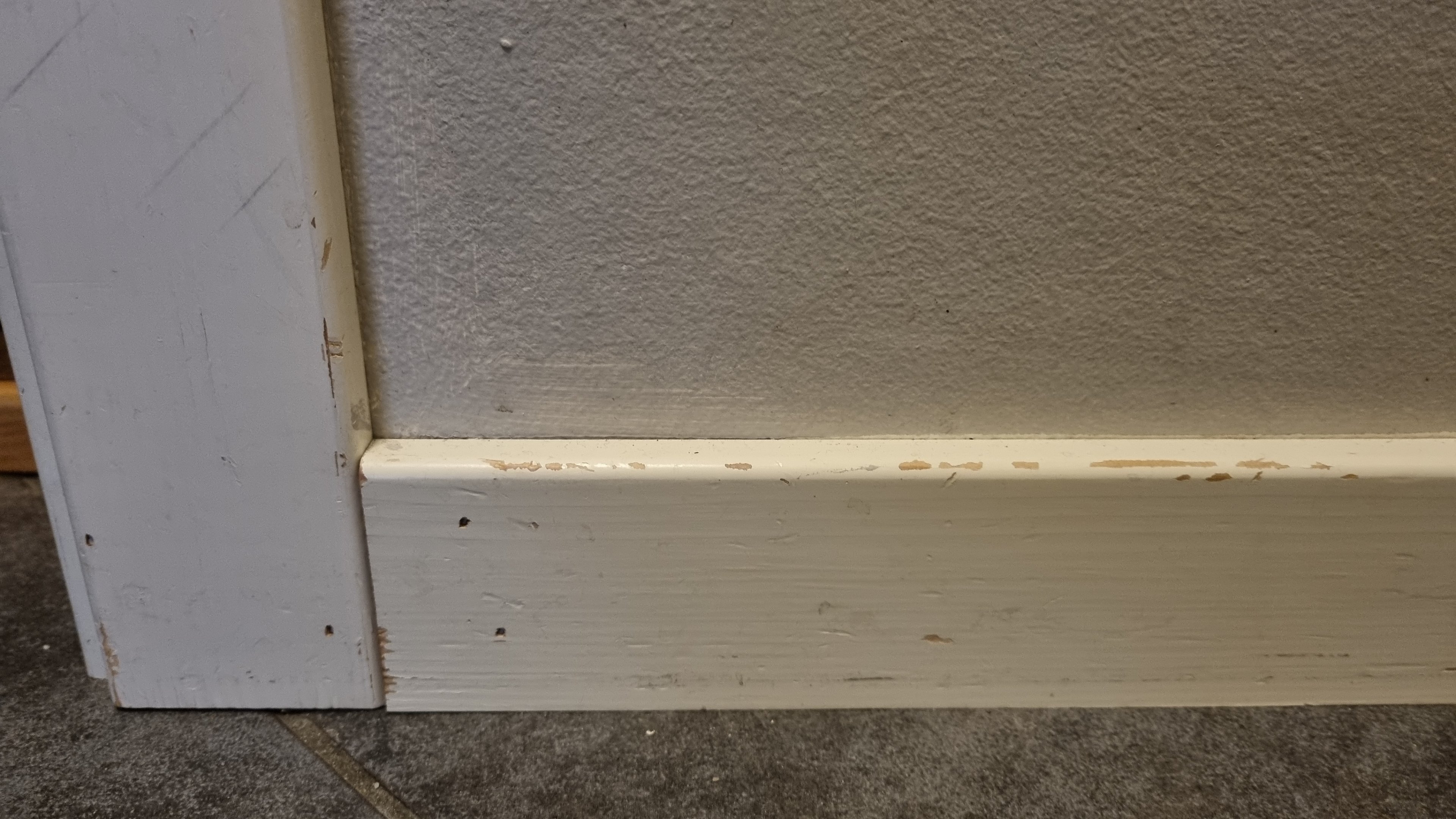 Skal selge huset (15 år gammelt) og noen av listene her er ganske slitte, etter både barn og en overivrig vaskehjelp. Lurer for så vidt både på om det er noe poeng i å fikse slikt, eller om de fleste som kjøper hus uansett vil kanskje bytte listene helt eller male selv i egne farger. Og om jeg skulle gjort noe med dem, kan det være nok å bare påføre et lett strøk på direkten, eller bør jeg uansett ta dem av, slipe, (grunne også?) og deretter male på nytt før jeg fester dem igjen? Har ikke veldig mye tid på meg. Noen eksempler: