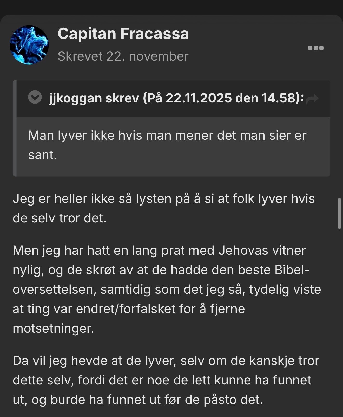 Capitan Fracassa svarte på BatorUlan sitt emne i Religion, filosofi og livssyn