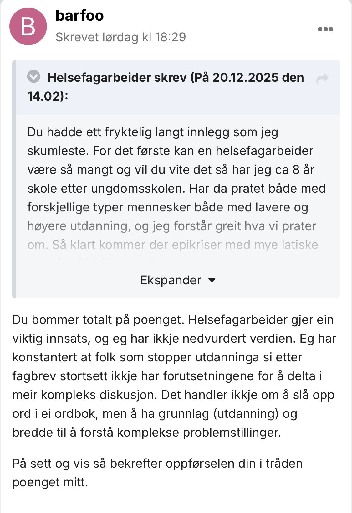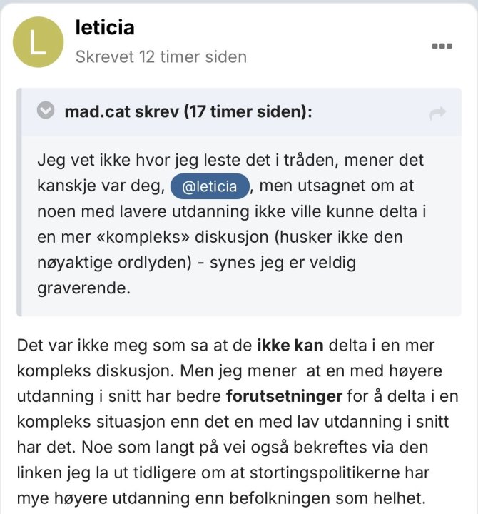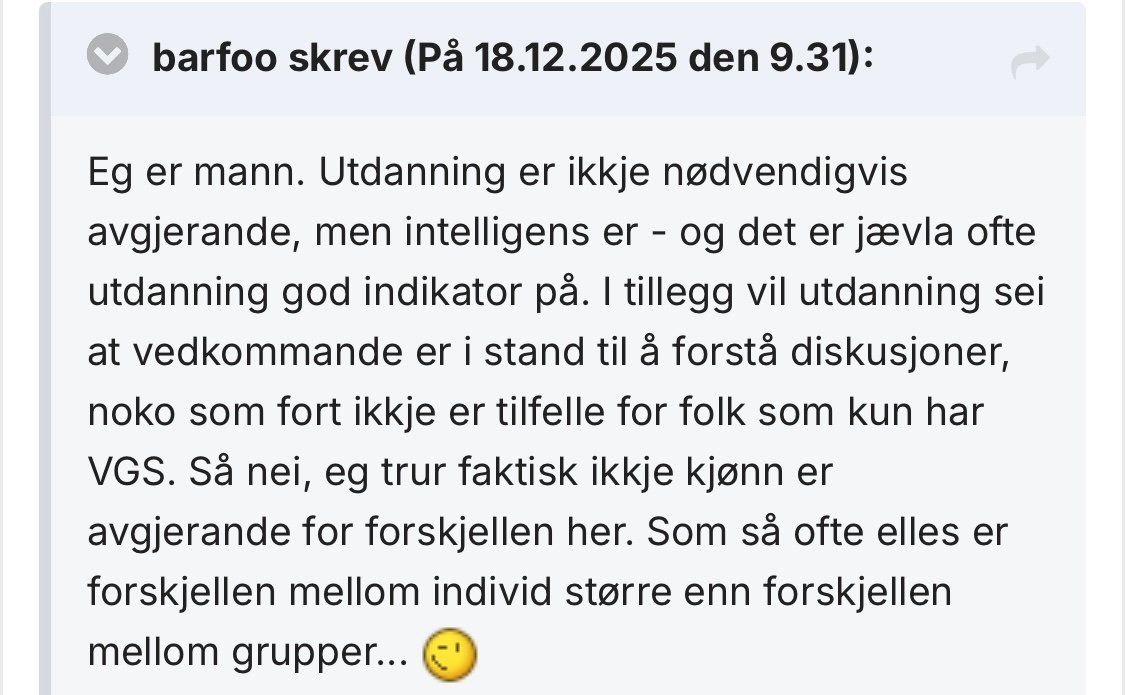 Jeg står inne for at jeg mener at folk med høyere utdannelse i snitt (altså på gruppenivå) har større forutsetninger for å delta i komplekse diskusjoner enn det folk med lav utdanning i snitt (altså på gruppenivå) har. Noe som jeg også har lagt ut linker av uttalelse fra forskere som snakker om høy utdanning blant politikere og det å forstå komplekse saker. Selv om jeg tenker at det er slik på gruppenivå, så kan man likevel hente ut en tilfeldig utvalgt person fra hver gruppe, og at det er den fra gruppa med lav utdanning som utmerker seg best. Man må skille på individnivå og gruppenivå. Men jeg har ikke sagt det i den konteksten du påstår. Om at jeg ikke vil velge en mann med lav utdanning fordi de ikke forstår komplekse diskusjoner. Det blir litt sånn klipp og lim, sette sammen ting og ta dem ut av kontekst ja. Jeg er mer opptatt av at man har likt verdisyn. Og det er den andre artikkelen jeg la ut, om at menn med lav utdanning og kvinner med høy utdanning, at verdisynet deres som gruppe ligger ganske langt fra hverandre. Angående menneskesyn , så har jeg flere ganger sagt at mennesker har lik verdi, og jeg har også sagt at utdanning ikke definerer et menneskes verdi. Som f.eks her hvor jeg skriver til helsefagarbeider: "Som jeg sa til deg i forrige innlegg, så er det ikke lengden på en utdanning som setter et menneskets verdi. "