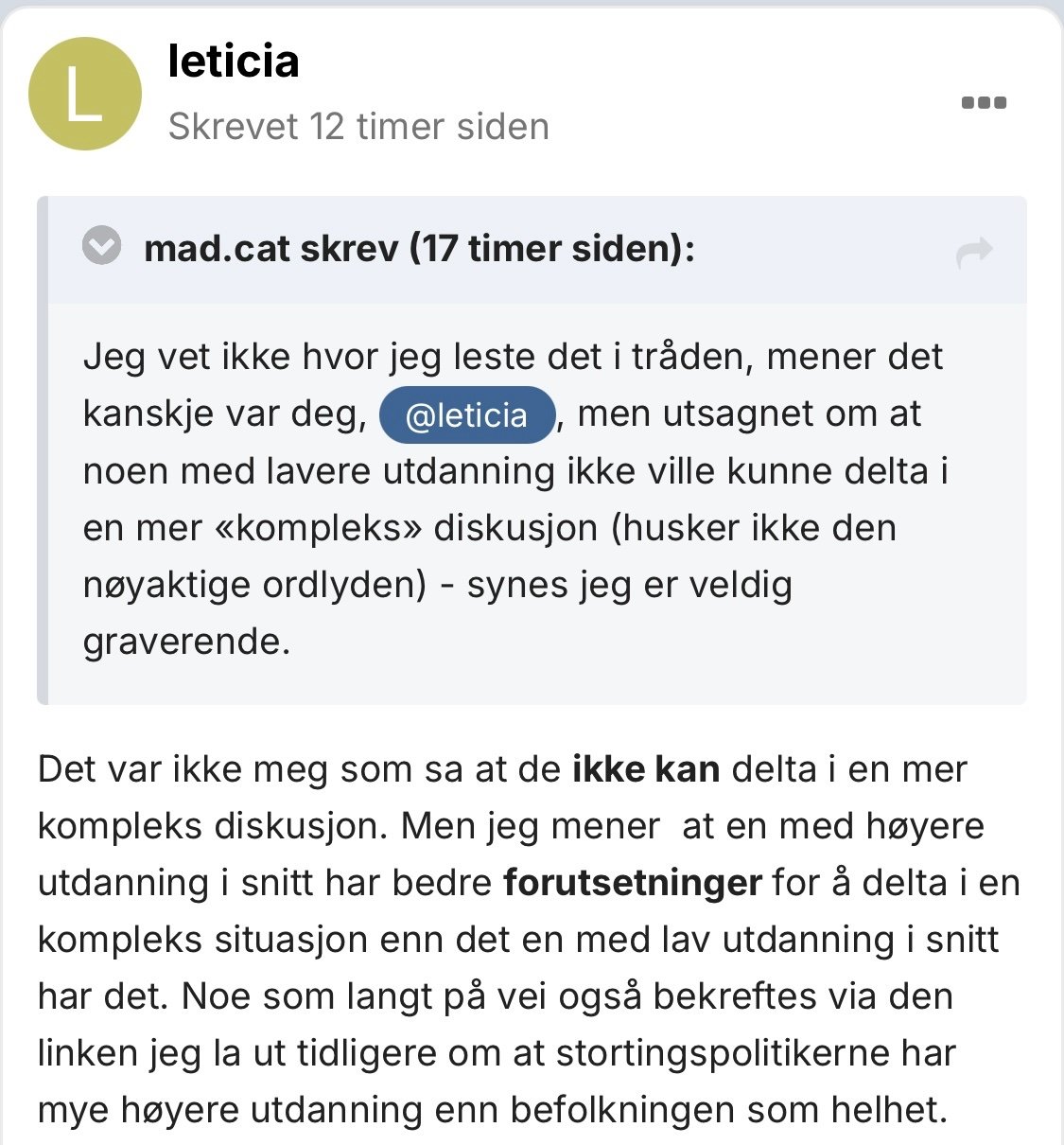 Joda, noen har sagt det jeg forholder meg til. Jeg sier også i mitt oppprinnelige innlegg at jeg tror og er usikker (begrep jeg brukte) men nå har jeg virkelig tatt meg bryderiet med å lete gjennom fra starten av tråden for å understreke nøyaktig hva jeg synes er påstander jeg mener ikke bør stå som sannheter. (Se innlegg over) Jeg skjønner ikke @leticia… du står vel inne for påstanden din om at «de med lavere utdannelse har dårligere forutsetning for å delta i en kompleks diskusjon» ? Hvorfor da hevde at det aldri er sagt? Det er jo essensen jeg er uenig i. Ikke at du har din rett til å mene det, du må gjerne mene dette og som sagt så kunne du sagt det samme om mennesker av en annen rase, for all del, hva du mener og foretrekker er ikke hva jeg argumenterer mot, men menneskesynet og den grove generaliseringen og forenklingen om at slik er det. Andre brukere er jo langt mer bombastiske i sine utsagn og det skal du selvsagt ikke stå inne for (selv om jeg antar du er mer enig med dem enn med meg) - mitt argument er at et slikt menneskesyn er ikke noe jeg står inne for eller synes skal forbli uimotståelig. Jeg ville eksempelvis ikke gitt dette som en slags faktum til mine barn den dagen de skulle begynne å date: « husk at de med lavere utdannelse har mest sannsynlig dårlig forutsetning for å delta i en kompleks diskusjon med deg» - nettop fordi jeg finner utsagnet grovt generaliserende (marginaliserende) og en forenkling av virkeligheten. Dette er ironisk nok hvordan du definerte en diskusjon som ville være av preget av manglende kompleksitet. Noe FRP’ere ville finne på å gjøre. kanskje har du en liten FRPer selv i magen?