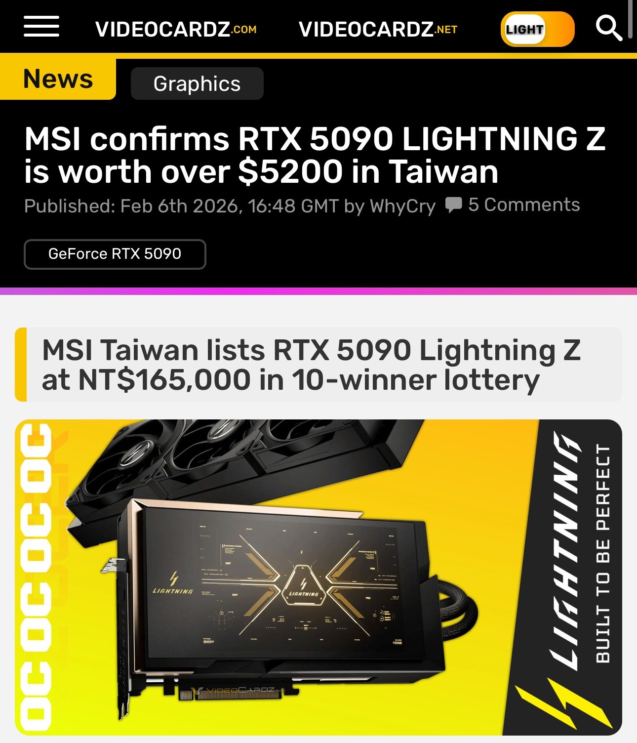 Noen andre som er fascinert av det nye monsteret til MSI: MSI 5090 Lightning Z har en veiledende pris på 5200 usd, med Norsk moms og skatt vil dette legge seg på rundt 70 000 nok. Hva er spesielt med dette kortet. Det blir kun laget i 1300 eksemplarer, limited edition. I de landene hvor det lanseres må man vinne et lotteri for å kunne bli blant de 10 som får en kjøpslink. Mener jeg fant på nettsiden til MSI at proshop er distributør for kortet i Norge, blir antageligvis 10 tilgjengelige kort her, dersom det jeg fant på MSI sin nettside stemmer. Skjermkortet er spesielt fordi det bruker 2x 12V-2x6 og anbefaler en PSU på 1600W. Skjermkortet har tre profiler, og to BIOS konfiguasjoner. En stock profil hvor kortet trekker 800, og en OC profil hvor det trekker 1000W. Hvis man ønsker å bruke den enda mer ekstreme OC profilen må man ha 2x1600W PSUer, i tillegg til at garanti ikke dekker overklokking hvor kortet kan trekke opp til 2500W. Skjermkortet kommer med en 8 tommers skjerm som bakplate, som kan vise spesifikasjoner og monitorering. Den er vannkjølt med en 3xradiator hvor væsketrykket skal være 44% sterkere enn på andre AIO kort i følge MSI. MSI meddeler også at kobberplaten/blokken i skjermkortet er den største som noensinne er laget/brukt i et skjermkort. Reporteren til PCMag UK forteller at det er den tyngste kobberblokken han har holdt. Skjermkortet har også et massivt 40-fase design på GPU-brikken for å takle den massive strømbruken. Kortet blir dessuten levert i en limited edition box, hvor skjermkort og kjøler står oppreist. Er dette kortet for vanlige brukere, neppe. Det er nok myntet mot entusiaster som ønsker å overklokke det til det ytterste, for å se hva som kan presses ut av Nvidias flaggskip. 5090 Lightning Z skal visstnok takle 3 742Mhz, men det ikke oppgitt om dette er med 1000W eller over. Uansett er dette rundt 600-650mhz høyere enn hva man får til med dagens 5090 Astral LC, som yter ca 6% mer i 4K enn 5090 FE med base boost clock, i følge techpowerup. Hvis MSI 5090 Lightning Z skalerer like godt på overklokk som Astral LC, er det tenkelig at 5090 Lightning Z legger seg 10-12% over Astral LC i 4K. I teorien, kan det bety at 5090 Lightning Z kan legge seg knappe 5% bak RTX 6000 Pro (workstation) i følge techpowerup sine tester. Blir spennende å se benchmarks, når det kommer, og se om dette er tilfelle. Vet at dette er et helt absurd kort, men blir dog veldig fascinert.