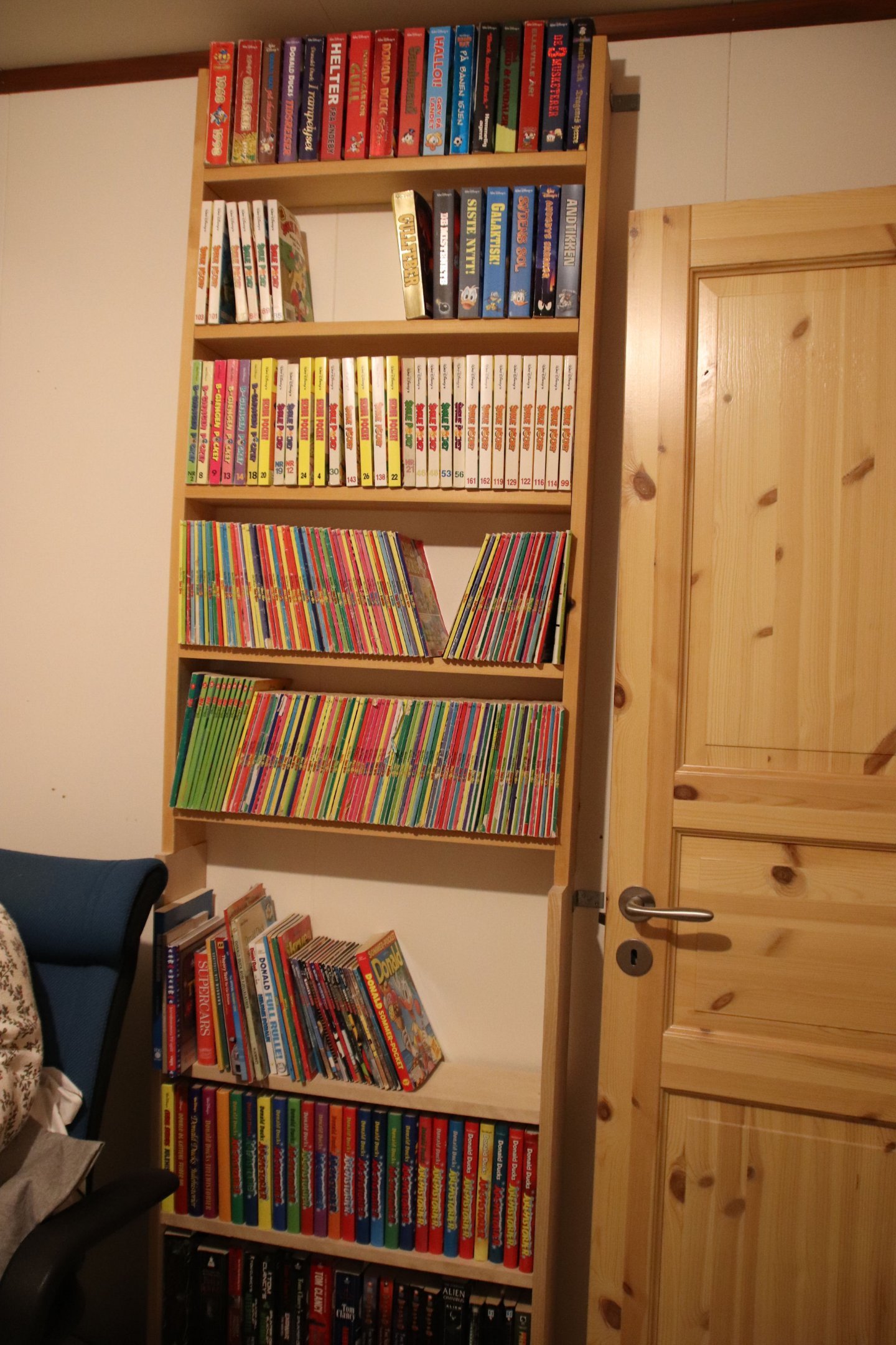 Så... @spetter ville gjerne se hele samlingen min. Min første tanke var "forgive him, Lord, for he know not what he asks...", men etter å ha vært opp og ned huset et par ganger tror jeg at jeg fikk tatt bilder av alt. Kjelleren / gamingrommet: Donald blader i permer, og spill fra dengang man fikk fysiske utgaver, pluss musikk Soverommet, foran sengen: Pockets, Mammutbøker, og Don Rosa og Carl Barks komplette samling. Pluss Lucky Luke, Asterix og diverse blader. Og noen bøker. Soverommet, bak sengen: Hakkespettkommandoen, Mikke Krim, Skrue- og B-Gjengen pocket, Julehistorier og temautgaver. Pluss noen bøker. Soverommet, over sengen: