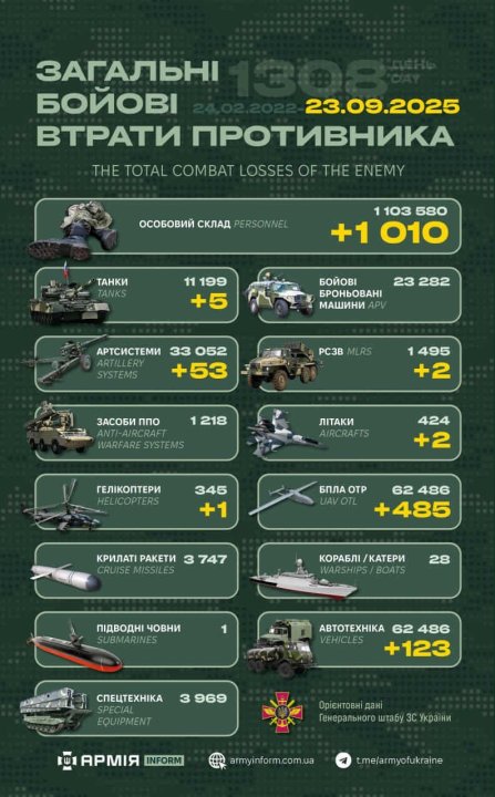 Ukraine Destroys Russian Ammo Depot With Over 19,000 Drones and Rare ZUBK14 Tank Missiles Ukrainian defense forces have destroyed a major Russian ammunition depot in the occupied settlement of Bohdanivka, Luhansk region, eliminating stocks of precision tank rounds and large quantities of drones. According to the General Staff of Ukraine on September 22, Russian troops had organized the site as a distribution point for the 17th Tank Regiment of the 70th Motor Rifle Division. https://united24media.com/latest-news/ukraine-destroys-russian-ammo-depot-with-over-19000-drones-and-rare-zubk14-tank-missiles-11834 ------ Nye Ukrainske angrep:9 poeng