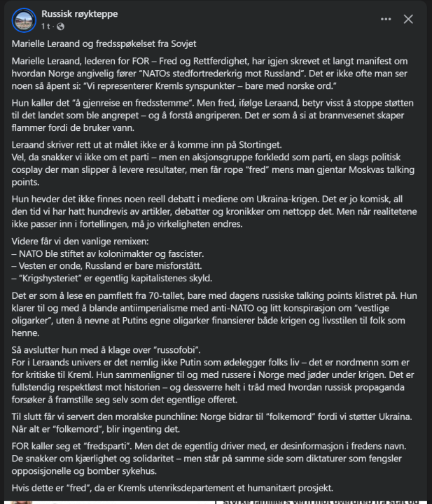 Russland er en kreft for europeisk sivilisasjon. Vi burde finansiere separatistgrupperinger innad i Russland. Ellers vil vi aldri få reell fred. Samtidig burde europeiske land øke den totale beredskapen til 500.000 soldater i hver enkelt land. Se og lær av Finland. Det er mer enn nok til å knuse en eventuell russisk offensiv de neste 10 årene. Også burde den gamle generasjonen politikere som heller tiden nevner "dialog" byttes ut. Vi trenger frisk blod.15 poeng