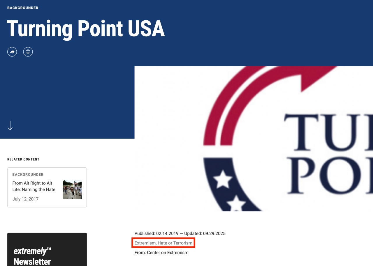 Nei, lenge før drapet på Kirk. ADL har kategorisert Turning Point i ekstremistisk/hat-kategorien på grunn av deres Professor Watchlist, en liste de har med lærere og professorer de mener har sentrum/venstreorienterte synspunkter, som har ført til forfølgelse og doxxing. Som ADL skriver har også en rekke av organisasjonens ledere kommet med grove rasistiske, homofobe og andre hatefulle utsagn.