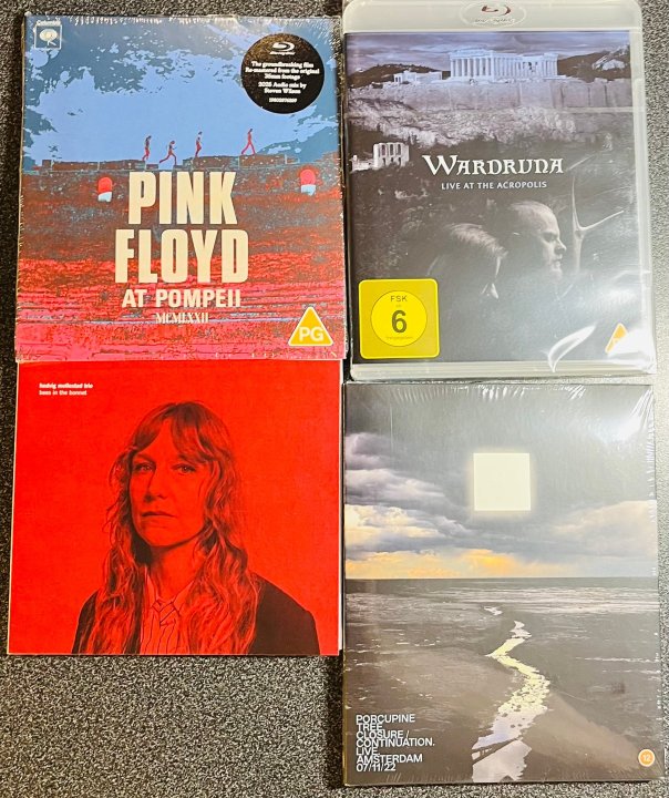 Leveranse fra Platekompaniet: CD: Hedvig Mollestad Trio - Bees in the Bonnet Konsertfilm på Bluray: Pink Floyd at Pompeii MCMIXXII Wardruna - Live at the Acropolis Porcupine Tree - Closure/Continuation - Live Amsterdam 07/11/22