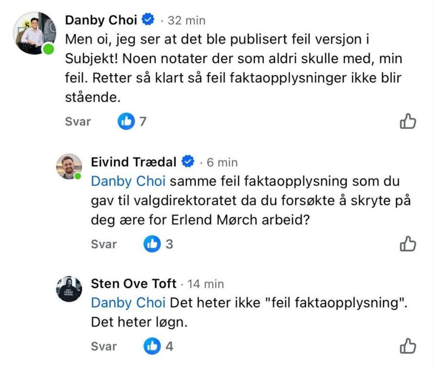 Ikke overrasket over det du sier der, selv om jeg ikke har fulgt med - føler jeg får nok av Kaur og Choi i feeden og alt ufrivillig nok. Ja, hele greia til Choi er å videreføre amerikanske kulturkrig til Norge, fordi det er lett å leve av. Han er i kontrær på grunn av at han ikke bryr seg om sannheten. Han gjør dette fordi han ikke bryr seg om konsekvensene. Han kan leve fett på å underbetale skribenter og ta pressestøtten til seg selv for en ny klokke eller mer av garderoben til Inspector Gadget. Ihvertfall når han ikke prøver å ta kred for andres arbeid med å lure til seg noen ekstra penger fra valgdirektoratet. Kaur er som å putte inn litt krydder i blandingen. Hun elsker jo oppmerksomhet akkurat som han. Man kan også argumentere at hun akkurat som Choi aldri har brydd seg om konsekvenser også.