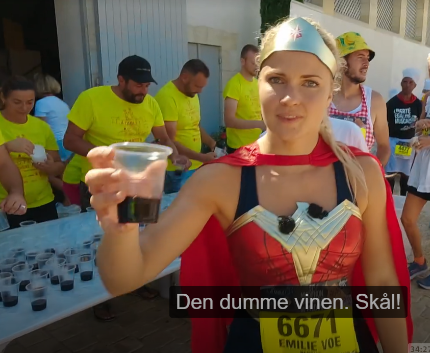 Med litt promille så henviste eg til NRK serien "fylla" og ikkje "helt Ramme sporter". Det var openbart at dei begge var regelrett dritings. Sjølv om dei drakk vin ved alle dei 23 vingårdane så var nok alkoholinntaket vesentleg mindre enn 23 einingar. Det starta med fulle vinglas men jo lengre ut i løypa dei kom så vart det mindre og mindre beger med vin. Ei alkoholeining med raudvin på 12% er 1,25 dl og mange av glasa dei fekk servert. Vedlagt er ein skjermdump av glas nr 20, dette 2 cl plastbegeret er i beste fall 1/3 fullt. Det er fortsatt mykje alkohol å helle i seg i løpet av 6 timar, men det er langt unna 23 alkoholeiningar. 12% alkoholprosent er også i det øvre skiktet for raudvin, eg tviler på at vingårdane har leita fram sine kruttsterke 15+% vinar til dette formålet. -