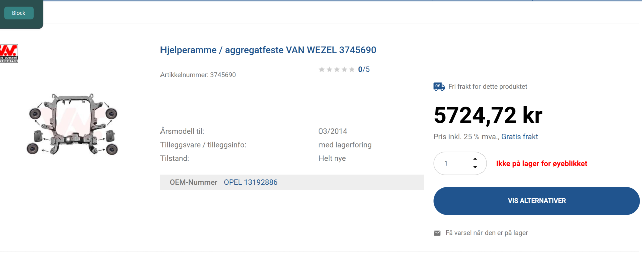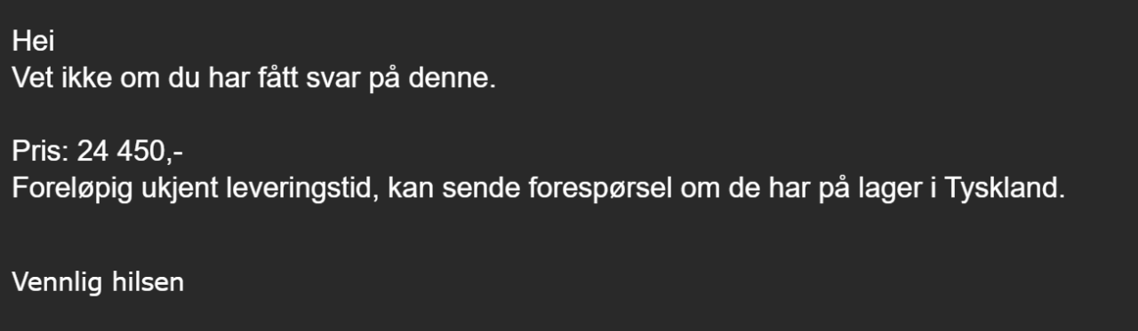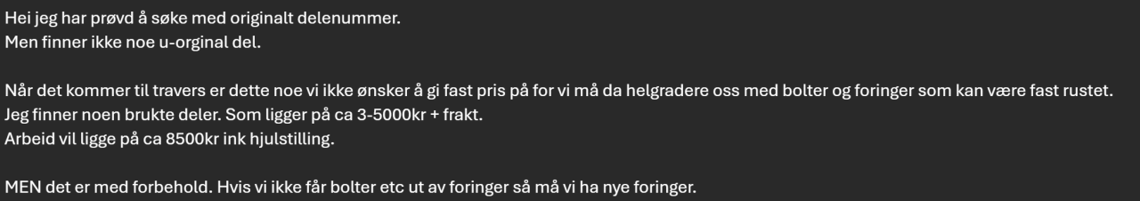 Jeg fikk svar på mailen jeg sendte igår hvor jeg spurte hvordan de kunne forsvare prisen på 37000kr kontra 3000kr. Basically de sier at de bruker leverandør som selger orginale deler med riktig passform. Ikke "kopideler" som har pleier å ha uriktig passform. Fine ord som kommer fra snapdrive. Det er nå jeg skulle hatt mulighet til å bestille travers gjennom "riktige kanaler" bare for å se om prisen ble den samme. Ha. Tror dere det er mulig å få svar på det også vis jeg stikker innom en merkeforhandler å spør hva det vil koste å bestille ny travers/hjelperamme til min bil? Skader ikke å prøve """ Hei, Det er fordi vi har hentet pris på ny oss merke forhandler, som normalt har rett passform på delene. Etter marked/ kopi deler har ikke alltid rett passform. Vi har heller ikke avtaler med nettfirma som seller kopi deler til biler 😊 Men du står fritt til å kjøpe deler der det måtte passe deg. Så kan vi ta jobben, prisen blir med forbehold at det kan komme ekstra deler som normalt ruster fast. """