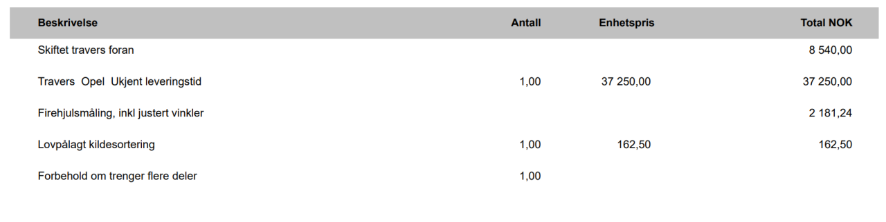 Hei Jeg tror Snapdrive ikke ønsker denne jobben =D Jeg kom fra EU kontroll på NAF hvor de sa jeg trengte å bytte travers fremme på min Opel Meriva 2010. Det første jeg gjorde var å stikke innom snapdrive å ba om pristilbud. Etter noen timer fikk jeg tilbudet. 37 000kr koster visstnok en ny travers fremme. Jeg visste det var dyrt, men så dyrt? Det høres ut som om de smører litt tykt på og i praksis sier dem at "vi vil ikke ha denne jobben". Jeg har jo prøvd å google etter svar, der finner jeg alt fra 4000kr til 14000kr så jeg vet ikke helt hva man skal tro. Jeg trodde jeg kanskje måtte ut med rundt 20 000kr. Er det snakk om 45 000kr så vraker jeg lett bilen