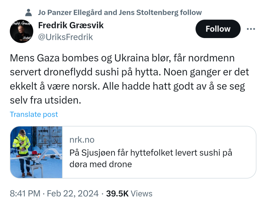 Vet ikke om det er innafor, isåfall kan det slettes. Men jeg skulle likt å sett noen dyktige grave journalister og datakyndige ettergå de mest prorussiske profilene på norske nettsider, hovedsakelig vg kommentarfelt, Facebook og X. Litt vatniksoup eller enda mer grundig. Jeg mistenker at flere av dem ikke er ekte engang, eller stjålne identiteter. Jeg kan ikke fatte hva slags mennesker som støtter Russland i denne krigen Ivan kluge eller hva han heter eksempelvis på Facebook, eller @KSkogholt på Twitter/X- 84 117 svar