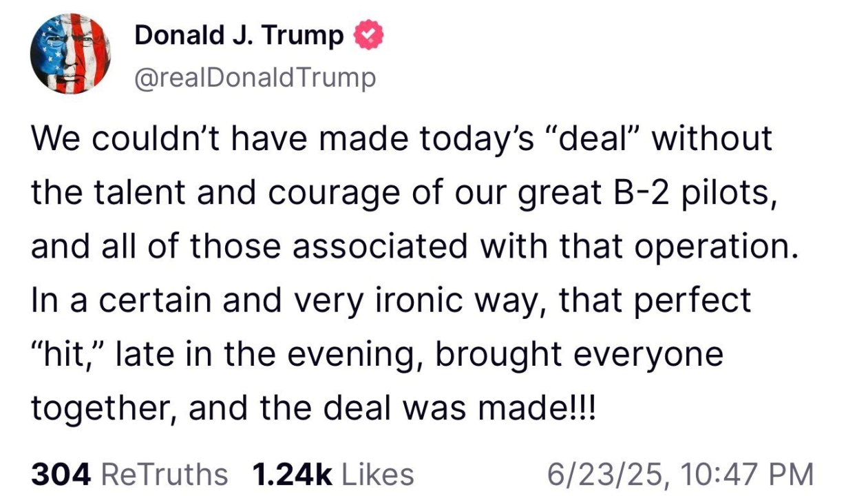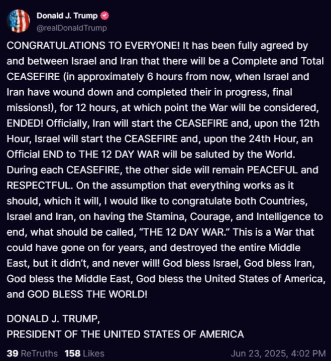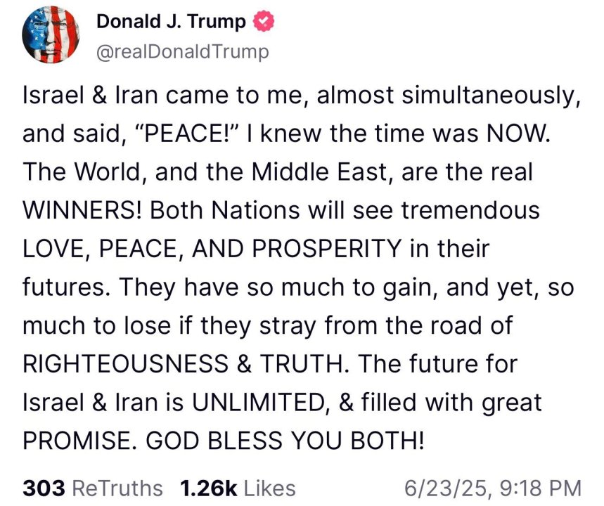 Det hele virker idiotisk lagt opp. Jeg tror Trump har annonsert en fredsavtale som ikke eksisterte da han annonserte den— Også har han bare tatt det på sparket etterpå og bedt begge sider om å slutte —— Samtidig som han tweeter/truther bisarre meldinger hvor han hyller seg selv og snakker om en hvor "vakker fred, fylt av kjærlighet og fred" han har skapt. Trump: A great future full of love and peace awaits Israel and Iran …