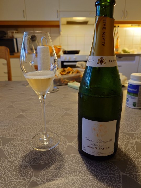 Idag har vi bryllupsdags feiring med "egen"fisket store Krabber og marinert ovnsstekt kylling med salat litt fløtesaus og ris. Og en god champagne fra vinklubben. Alain Bailly Cuvee Petronille Blir en halv chilensk rød til kyllingen. Konas egen berømte eplekake og vaniljeis til dessert.