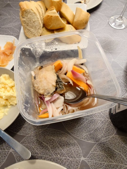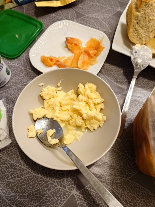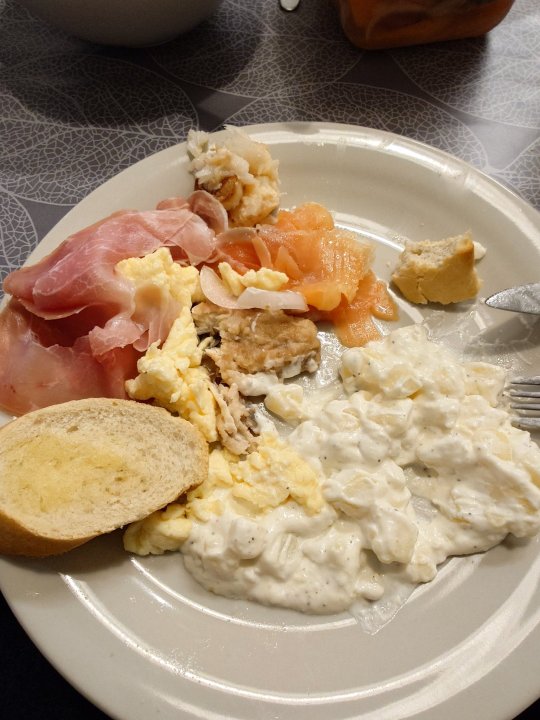 Idag Hjemmelaget gravlaks, og hjemmelaget sur makrell, og krabbeklør og eggerøre og norsk stranda spekeskinke og potetsalat.