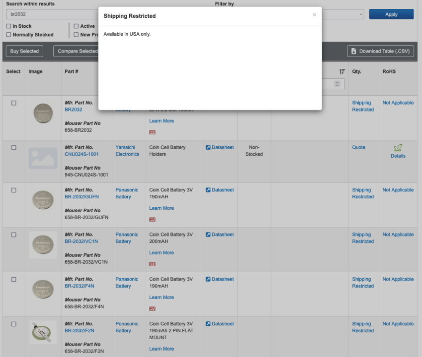 Jeg tok en titt hos Mouser.no igjen (passet godt på at jeg valgte ".no" siden), men virker nesten som de ikke har et norsk lager (men antageligvis bare har en norsk toll/moms ordning for kunder her) og sender varene fra USA. Dermed tillater de ikke at batteriene sendes til norske kunder: Duracell nettsiden har jeg faktisk bestilt fra tidligere kom jeg nettop på! Fikk tak i et kamerabatteri til en brøkdel av prisen til originalmerket, og fungerte minst like bra. Men BR-2032 hos dem er jeg usikker på -jeg får ikke frem noe detaljert info hverken der eller ved å søke ellers på nettet, så kan godt være at de bare kaller det BR-2032 selv om det har CR-2032 spesifikasjoner. Jeg har nå søkt hos de andre elektronikkforhandlerne og kommet frem til følgende: - no.Farnell.com: fant ikke BR-2032, men da de virker å bruke noen merkelige koder istedenfor de vanlige batterimodellene er det fortsatt en ørliten sjanse (dessverre dukket det ikke opp da jeg spesifikt filtrerte søket etter "Panasonic" heller) - Mouser.no: har BR-2032, men leverer ikke til Norge - Digikey.no: har ikke BR-2032 (kun CR-) - Arrow.com: har BR-2032, men må bestille min. 103 stykk, og ikke norsk nettbutikk så usikkert om de sender batterier til Norge - no.rs-online.com: har ikke BR-2032 (eller noen andre 2032 batterier!!) Da kommer jeg ikke på noen flere "norske" nettbutikker utenom Elfa, så jeg får kanskje sette sammen en bestilling derfra, og kanskje kjøpe flere BR-2032 batterier med det samme jeg er der (de har visst veldig mye bedre "shelf-life" enn vanlige CR-2032). -