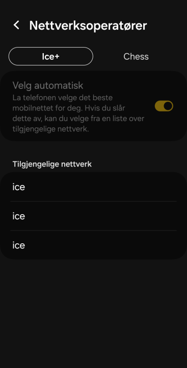 Jeg befinner meg i Sarpsborg, og kan nå velge å koble meg til hos både Telia, Telenor og selvfølgelig ice. Skulle ønske det var sånn hele tiden, at man kunne velge nettverk etter dekning. 🤪
