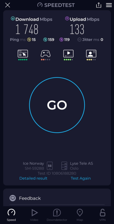 Fikk hastighetene her i Sarpsborg sentrum. Jeg har 40 GB kvote og full rollover oppspart. Det gikk 5 GB rett ut vindu på den testen der 😂