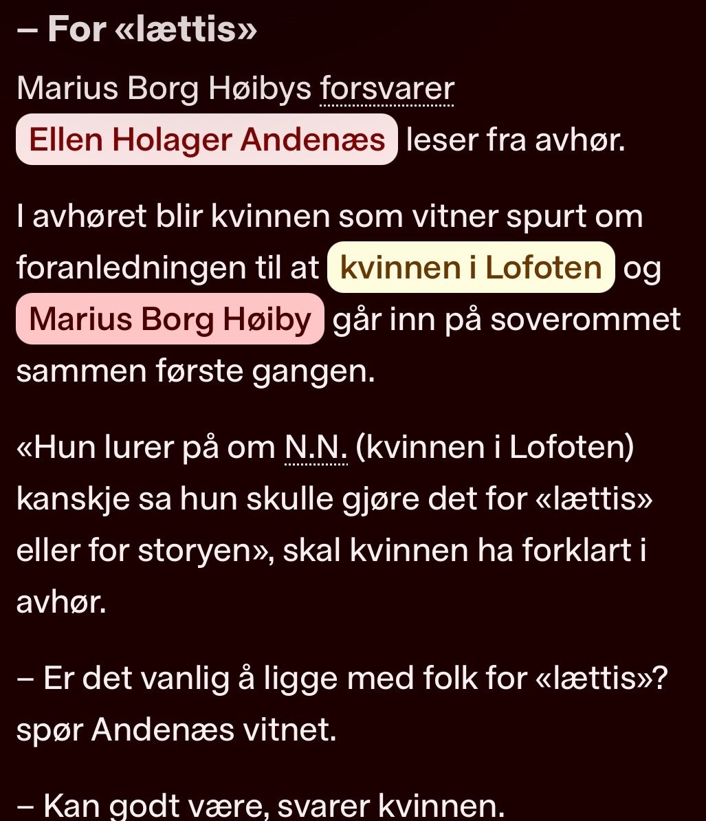 På ingen måte utnyttet Marius Høibys status for egen vinning, nei. Men hey, det var jo ikke viktig hvor hun hadde vært den natta. Handlet mest om å skryte at hun hadde vært på fest hos Mette-Marit, og om få venninna si til å lyve. Merk at dagen etter sier hun at hun dro hjem kl 07. Hvorfor skulle hun si det når hun hadde sovet og ikke var helt klar etter henne selv: neddopet Vel, hun var åpenbart helt klar i toppen dagen etter også. https://www.nettavisen.no/nyheter/venniner-av-den-ene-fornarmede-vitner-i-saken-mot-marius-borg-hoiby/s/5-95-2866130