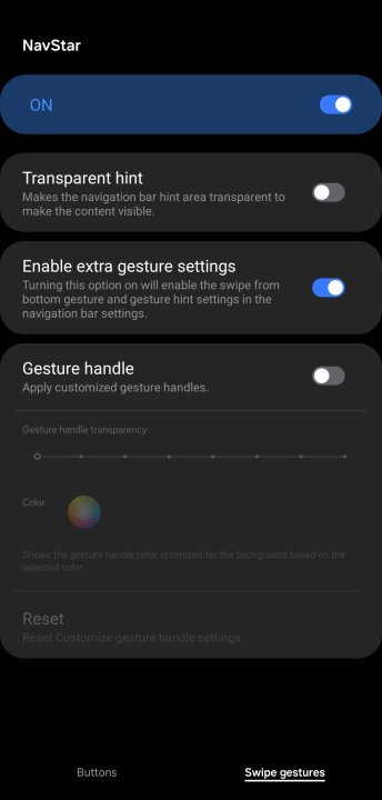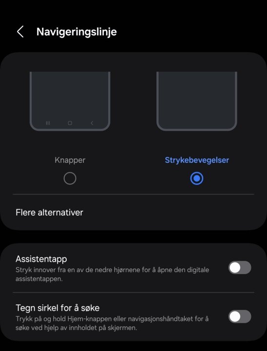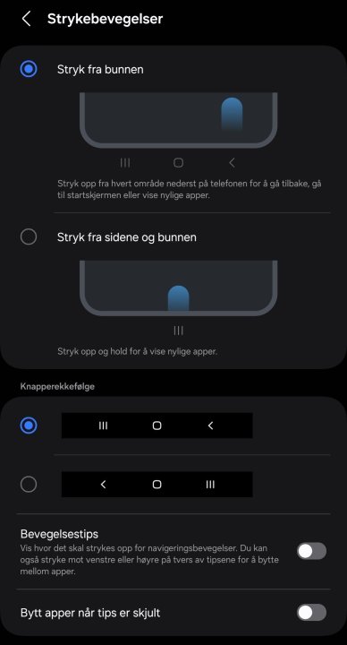 Jeg er ikke helt sikker, men du må altså tilbake til den orginale menyen på telefonen og ikke i den appen. "Instillinger" -> Skjerm -> Navigeringslinje ->Velge strykebevegelser så "Flere alternativer" for å finne det siste bildet. Edit: Jeg lastet ned denne versjonen pga. jeg leste en eller annen plass der den ble anbefalt. Men jeg vet ikke forskjelle på de ulike versjonene