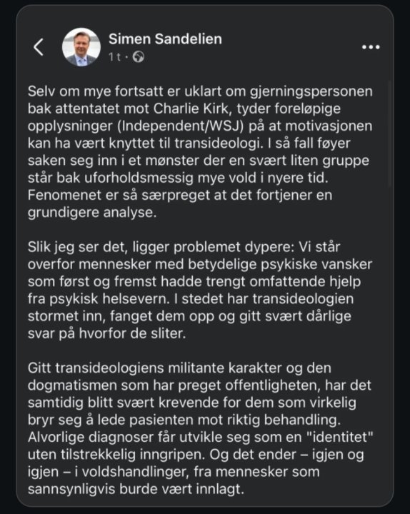 Men er vi ferdige med transhatet nå? Jeg har sett flere som har frontet 'transideologi' som årsak og ikke minst gjerningsperson, på diskusjon.no, på facebook ( til og med av en norsk politiker) og i diverse media. Er det fortsatt en overbevisning? Jeg selv har stusset litt på dette, men selvsagt, om det kommer noe faktisk informasjon som bekrefter det så skjønner jeg eventuelle reaksjoner på det.