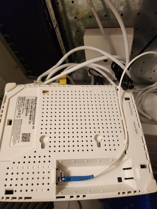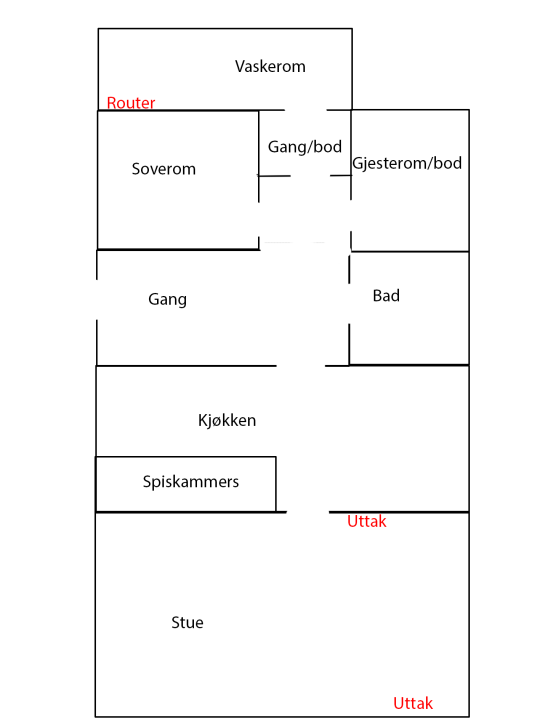 23. Jeg har ikke peiling på hva jeg snakker om så jeg tenker et bilde er enklere. Denne kan vel ikke flyttes? Slik jeg forstår det går signalene inn i denne og så deles de via kabel til de andre uttakene (i tillegg til trådløst som ikke rekker frem dit jeg trenger det). Edit: La ved "plantegning" av 1. etasje av hytten. Ikke tegnet etter mål. Ca 12 x 8 meter. Asus-routeren står nå ved uttaket i stuen, nærmest kjøkkenet. Gir god signalstyrke der det trengs, men er veldig ustabilt når flere bruker nett samtidig. 2 etasje er 3 soverom, et lite bad og en gang. Uttak for internett ganske midt på.
