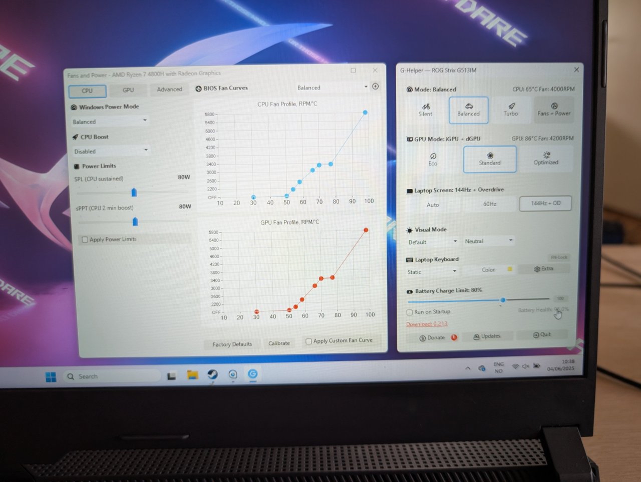 Sjekk om du kan bytte cpu boost fra aggressive til disabled. Og last ned g helper. Kan være fordel rense vifta eller bytte kjølepasta. Men Asus kjører høy temperatur på laptop uansett.