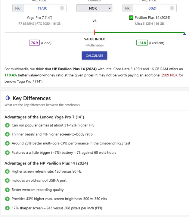 Hp scorer ganske mye mer på media. om det så kan være ting testen ikke sjekker. https://nanoreview.net/en/laptop-compare/lenovo-yoga-pro-7-14-vs-hp-pavilion-plus-14-2024?m=d~1.r~16-and-c~3198.d~2.r~16&uc=multimedia