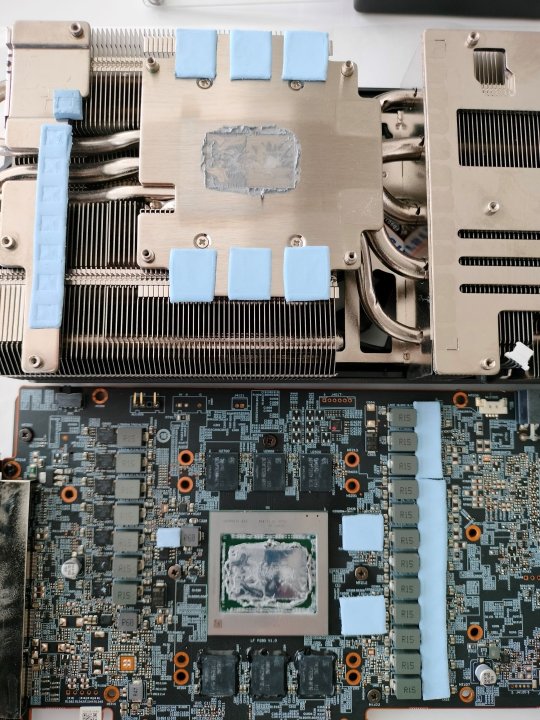 Hei godtfolk. Grunnet høy hotspot temp på min AMD RX 6900 XT har jeg valgt å teste ut Thermalright Heilos. Startet Time Spy og etter få minutter var hotspot 110c med standard GPU settings. Med undervolting senket hotspot ned til 100c, fremdeles for høy. Diverse bilder av jobben: Pump Out av gammel kjølepasta er grunnen til høy hotspot. Heilos 40x40mm klippet til rett str, nok til 2 GPUs. Alt montert og klar med samme undervolt settings jeg hadde før bytte. Etter Time Spy Extreme Stress Test 20/20 loops var hotspot på max 69c (65-69c). Veldig fornøyd så langt, tiden får vise om dette er løsningen på hotspot problemet mitt. Får oppdatere tråden etter noen mnd.