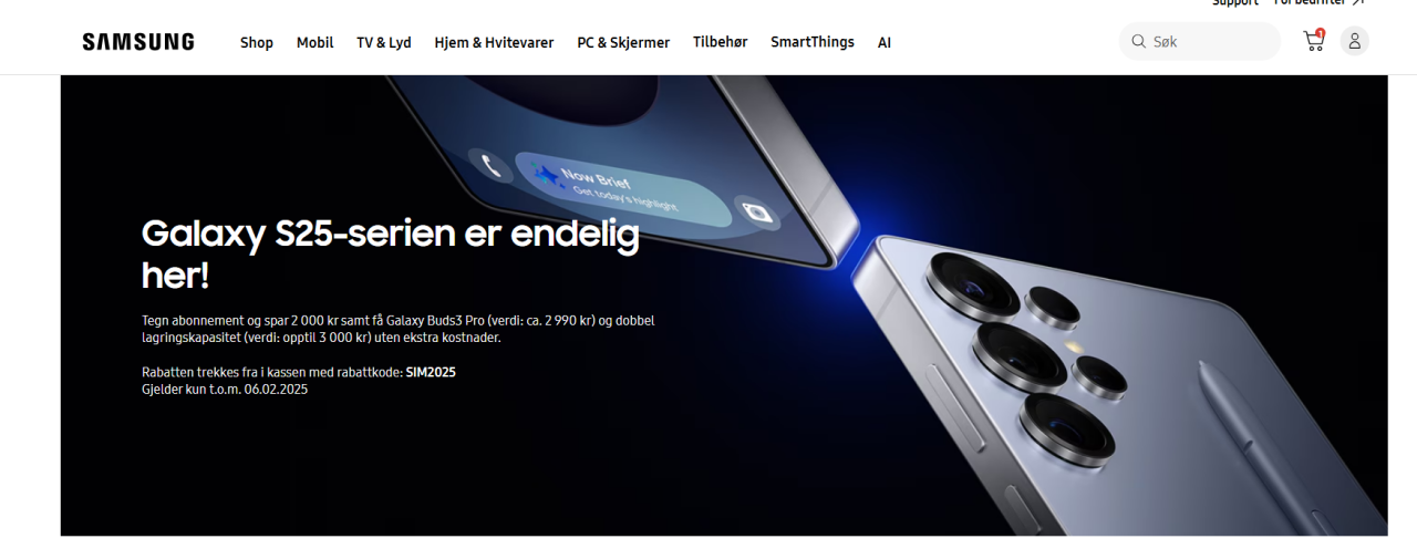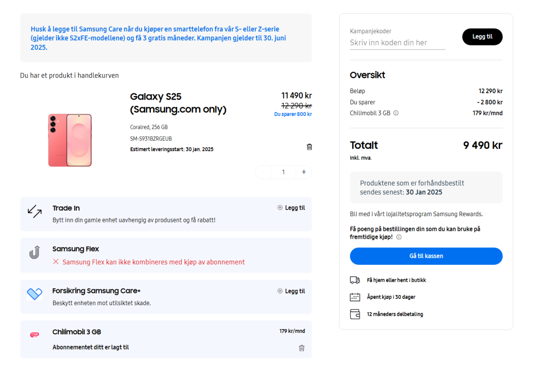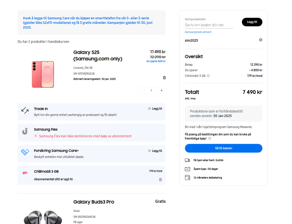Fant jo ut greia med "sim2025" koden , den gjelder for når man egentlig skal kjøpe s25 med abonnement Men når jeg adder Chili til en s25 ordre så går prisen ned med 2k adder jeg koden så går den ned med 2k til så som vanlig sikkert en feil med siden til Samsung https://www.samsung.com/no/plans/chilimobil/already-customer/ for har en s25 kurven nå 12290 -800kr for dobbel lagring delen -2000 for chilli 179kr abonnement adder "sim2025" koden -2000 til så da nedi 7490 for en s25 256gb med gratis buds3pro Tok en trade in på s22u min (-5500) under 2k greit bytte for 3år gammel tlf