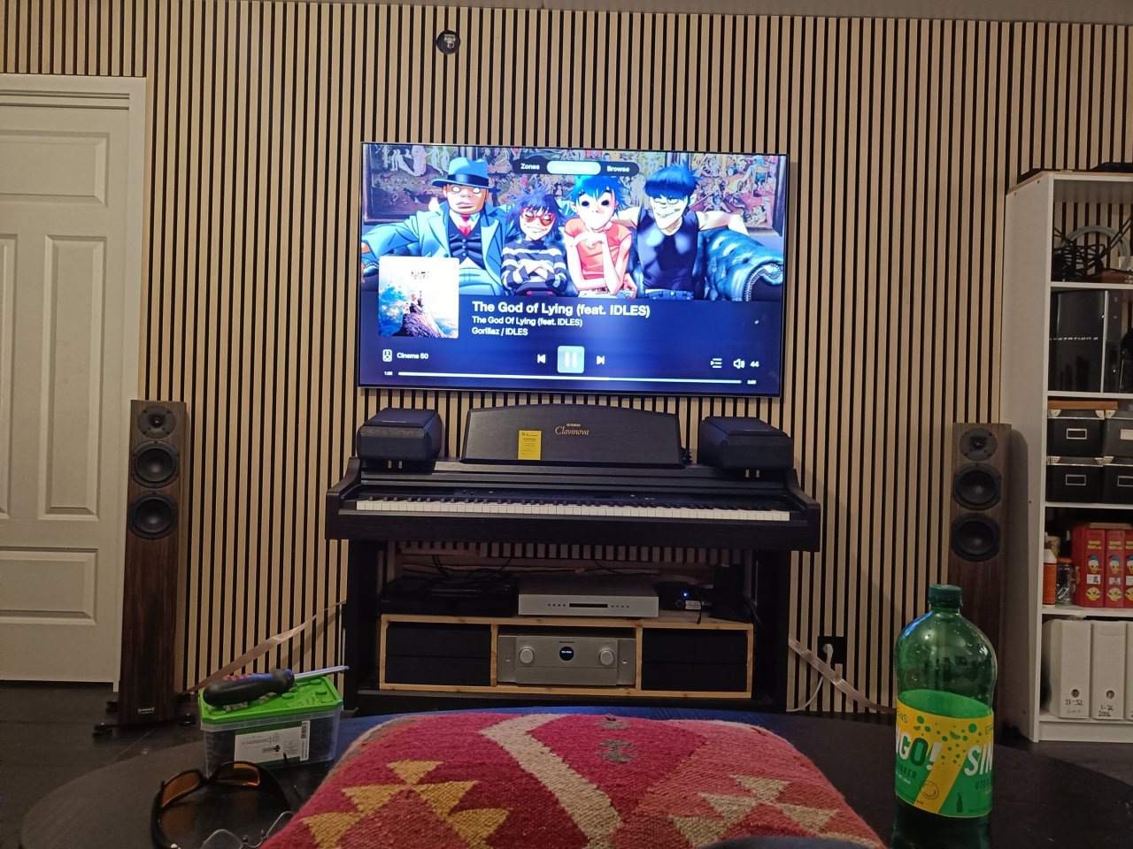 Venter på deler for å bygge om Virgo (Bl.a. noen skikkelige terminaler). Amp som skal drive bassene er kommet ett hakk videre i den forstand at jeg har funnet hvordan de skal stå i racket. Satt sammen ett enkelt rack med hobbyplater jeg hadde liggende (i flere år....). Så nå skal det testes hvordan det går med Marantz slik som dette: Det skal sies at der er "forced air" gjennom dette racket (fra baksiden til front). Noe som gjør at det er mulig å ha mindre luft rundt komponentene. Luften vil strømme der det er minst motstand; og det er lagt opp til at dette skal bli gjennom kjøleribber i enhetene. Bass Mono blokkene på hver side av Marantz har massive kjøleribber på baksiden som da vil få en god del luft over seg ved hjelp av forced air. I første omgang tar jeg da en papp-plate og dekker over åpningen over komponent seksjonen. Da for å tvinge luften gjennom sprekkene rundt komponentene. Jeg slet med at Marantz ble veldig varm før, men det var pga en innstilling som ikke var nevnt med ett ord i installasjons-manualen; Sette høytalerenes nominelle motstand. Eller rettere sagt, dersom en har EN 4 ohms htt, så skal denne innstillingen settes til 4 Ohm selv om ikke alle htt er 4 ohm nominell. Etter å ha endret dette så ble den knapt lunken. For å stresse amp seksjonen og kjølingen så kommer jeg til å teste med Virgo V fullrange (4ohm), Spark V fullrange (4ohm) og noe sonus faber vegghøytalere (6ohm tror jeg) samt patos basic 100. Slenger vel på noe bose greier for å få de siste kanalene for atmos slik at alle amp-seksjonene i AVR er i bruk. Så får vi se om det blir for lite luft eller om jeg kan bruke det slik og dermed gå videre til å bygge benken i farget mdf (svindyrt - så lite rom for testing med det materialet).