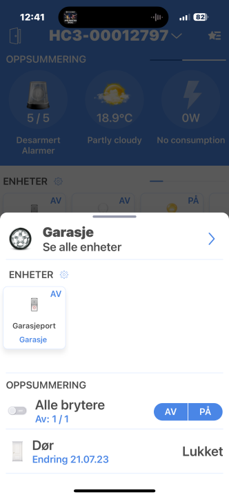 Det som er litt kjipt, er at bryteren som åpner garasjen, står som "Lukket" hele tiden, selv om den er åpen. Driver og flytter inn enda, ok når jeg kom til huset her en morgen, så var garasjen åpen.