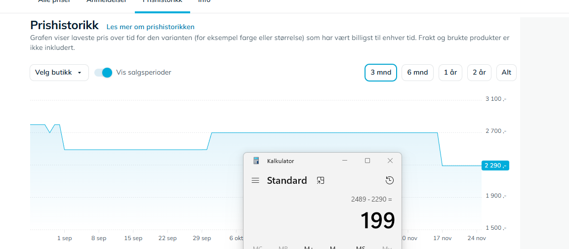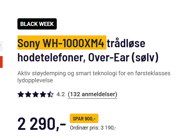 2. Ja, så da er det enda merkeligere at Flere har fortsatt med samme praksisen på de få tingene jeg har sjekket når dert er såpass lett å ta dem med buksen nede (man trenger ikke en gang å vite hva varen egentlig er verdt, bare å google litt), merker meg også at de største aktørene har nøyaktig samme pris, ren Magi ... Edit: Feks den nå utgåtte SonyHeadset modellen Sony WH-1000XM4 Komplett påstår den kostet: Men 3190 har ikke dette kostet om du søker 2 år tilbake en gang men det produktet ble satt opp til 2700 i Oktober... Uansett skal Komplett ha de til at man sparer 900 kr, men det må være med tanke på prisen for for over 2 år siden da, får man sparer 199 kr i forhold til prisen i Sommer & August: