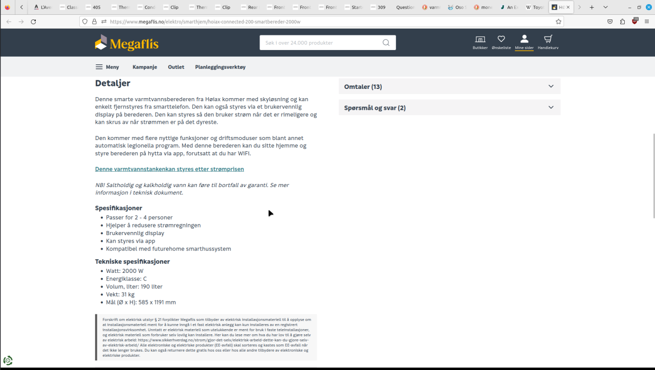 4. Garantien kan de gjøre som de vil med, men det som står i loven er følgende. § 15.Tingens egenskaper Tingen skal være i samsvar med de krav til art, mengde, kvalitet, funksjonalitet og andre egenskaper som følger av avtalen. Tingen skal leveres med innpakning og alt tilbehør som følger av avtalen. Det samme gjelder veiledning, herunder veiledning om installasjon, og eventuelle oppdateringer. Tingen skal passe til særlige formål som forbrukeren senest på tidspunktet for avtaleinngåelsen har gjort selgeren kjent med, dersom selgeren har akseptert dette. Tingen skal også være i samsvar med kravene som følger av tredje og fjerde ledd, med mindre forbrukeren ved inngåelsen av avtalen ble spesielt opplyst om at en bestemt egenskap ved tingen ville avvike fra disse kravene, og uttrykkelig og særskilt aksepterte dette avviket. Hvis det ikke er avtalt noe annet i samsvar med reglene i annet ledd, skal tingen a. passe for de formål som tilsvarende ting vanligvis brukes til b. svare til den mengde og ha de egenskaper og andre funksjoner, blant annet med hensyn til holdbarhet, funksjonalitet og sikkerhet, som er vanlige for ting av samme type, og som forbrukeren med rimelighet kan forvente ved kjøp av en slik ting c. være av samme kvalitet som og tilsvare beskrivelsen av en prøve eller modell som selgeren har gjort tilgjengelig for forbrukeren før inngåelsen av avtalen d. leveres med relevant tilbehør, slik som innpakning, installasjonsveiledning, bruksanvisning eller annen veiledning, som forbrukeren med rimelighet kan forvente å få e. være i samsvar med offentligrettslige krav som stilles i lovgivningen eller offentlig vedtak i medhold av lov på den tid kjøpet inngås, hvis ikke forbrukeren har til hensikt å anvende tingen på en slik måte at kravet er uten betydning. For ting som i samsvar med § 2 første ledd bokstav e skal leveres sammen med en digital ytelse, skal selgeren sikre at forbrukeren får informasjon om og får levert oppdateringer, herunder sikkerhetsoppdateringer, som er nødvendige for at tingen fortsetter å være i samsvar med lovens krav. Gjelder avtalen en enkelt levering av en digital ytelse, gjelder selgerens plikter etter første punktum i den tidsperioden som forbrukeren med rimelighet kan forvente ut fra typen og formålet med tingen og den digitale ytelsen og under hensyn til avtalens omstendigheter og art. Gjelder avtalen en løpende levering av den digitale ytelsen, gjelder selgerens plikter etter første punktum så lenge den digitale ytelsen skal leveres, men likevel i minst to år etter leveringen av tingen. Selgeren er ikke ansvarlig for mangler som utelukkende skyldes at forbrukeren innen rimelig tid unnlater å installere oppdateringer som nevnt i fjerde ledd. Dette gjelder likevel bare dersom selgeren har informert forbrukeren om at oppdateringen var tilgjengelig og om følgene av at denne ikke installeres, og den manglende installeringen ikke skyldes feil i installasjonsveiledningen som er levert til forbrukeren. § 16.Mangel Tingen har en mangel dersom a. den ikke er i samsvar med ett eller flere av kravene i § 15, med mindre det er avtalt unntak fra kravene i samsvar med § 15 annet ledd b. selgeren ved kjøpet har forsømt å opplyse om forhold ved tingen eller dens bruk som han eller hun burde kjenne til, og som forbrukeren hadde grunn til å regne med å få, dersom unnlatelsen kan antas å ha virket inn på kjøpet c. den ikke svarer til opplysninger som selgeren i sin markedsføring eller ellers har gitt om tingen eller dens bruk, dersom selgeren ikke viser at opplysningene før kjøpet er rettet på samme eller tilsvarende måte som de ble fremsatt, eller at de ikke kan ha innvirket på kjøpet d. bruken av tingen hindres eller begrenses som følge av krenkelse av en tredjepersons rett i tingen, for eksempel eiendomsrett, panterett eller immaterialrett, om ikke annet er avtalt. Første ledd bokstav c gjelder tilsvarende for opplysninger noen annen enn selgeren har gitt på tingens innpakning, i annonse eller annen markedsføring på vegne av selgeren eller tidligere salgsledd. Dette gjelder likevel ikke hvis selgeren viser at han eller hun verken kjente til eller med rimelighet kunne ha kjent til opplysningene. Forbrukeren kan ikke gjøre gjeldende som en mangel noe som har sin årsak i materialer som er levert av forbrukeren. Dette gjelder likevel ikke dersom selgeren på grunn av materialenes uegnethet burde ha frarådet bruken av dem. Jeg har ikke uttrykkelig og særskilt akseptert at reklamasjonsretten min bortfaller om vannet er for kalkholdig, samtidg så er det ikke nevnt på produktsiden at reklamasjonen kan falle bort der står det bare om garanti, og det at produsent frasier seg mangelansvaret bortgjemt i et teknisk dokument ville ikke jeg kalt spesielt opplyst om i alle fall. Takk for tips, skal høre med rørlegger angående testing av vann, kan jo være greit å vite uavhengig av reklamasjonssaken. Nei, kjøpte den de hadde med smartstyring for å spare mest mulig strøm, mulig den andre de har er bedre, men med den erfaringen jeg har nå så er Høiax et uaktuelt merke for meg i framtiden.