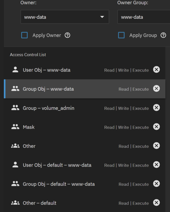 Jeg har satt opp en webserver-container i TrueNAS og koblet den til en volum-mappe. Containeren opprettet noen initielle filer med "www-data" som eier og gruppe, med 644-tilganger (rw-r--r--), og 755 (rwx-r-xr-x) for mapper. Jeg har laget en "credential group", volume_admin, som jeg har gitt tilgang til volum-mappen, med vedlagte ACL-innstillinger. Enhver bruker i "volume_admin"-gruppen kan nå navigere og lese filer i mappen... alt vel så langt. Brukere kan til og med opprette og kopiere nye filer og mapper... kjempebra! Men... Brukere har ikke tilgang til å redigere/skrive eksisterende filer. Hvordan kan jeg sette opp ACL for å tillate brukere til å redigere filer de ikke i utgangspunktet er eiere av? Jeg la også merke til at filer laget av meg var eid av "me:local_admin" (siden det er min primærgruppe). Finnes det noen måter å få filene til å bli eid av "www-data" slik at alle filene har samme eierskap, og ikke vil lage problemer i fremtiden?