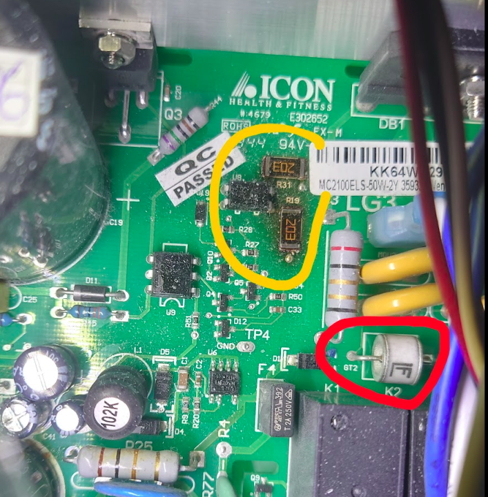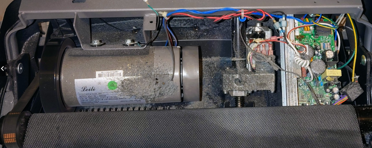 Det er en NordicTrack C1750 og ettersom det fort koster ~30K for en ny tenke jeg det var verd å se om det kunne fikses for langt mindre. Når jeg tok av plastlokket, ser jeg fort at jeg har vært dum og ikke gjort dette før for det lå et betydelig lag støv over de fleste komponenter. Jeg tenkte først å bare bytte sikringen hvis der er en slik og se hva som skjer, men den har en sikringstype jeg ikke har sett før (antar i al fall det må være sikringen - og dette var nok feil og det er vist istedet en "gas discharge tube" og således helt normalt at der ikke er nogen kontinuitet over den). Til venstre for den syns jeg også det er et par komponenter på kortet som ikke ser helt friske ut, så der er kanskje mer som har gått galt? Der er imidlertid ikke synlige tegn på skade på de store kondensatorer. Sist den fungerte var tidlig januar etter strømmen hadde gått i løpet av natten og på morgenen hadde den slått seg på helt av seg selv og kjørte... hadde nok kjørt sånn en 5-6 timer, men det var siste gangen jeg har sett den fungere. Ser ikke ut som noe som helst får strøm lenger, bare svart skjerm og ingen av knapperne fungerer. Finner nogen kort som har samme betegnelse (MC2100ELS-50W-2Y ZA0141 Rev A) og nesten samme modelnummer til en ~2500 kr fra Kina. Eventuelt kunne man sikkert få tak i en generell kontroller for de to motorer og så drite i å bruke den innbyggede skjermen & softwaren, men det koster fort det samme kan det se ut som. Motoren er en Leili 116ZY3-1 ( https://www.leili-motor.net/116zy.html ) på 3,6 HP, 130 VDC, 2685W. Kunne være greit å få testet om motorene begge er OK før jeg legger mer penger i prosjektet. Nogen som har vært bort i noe liknende, i så fall, hva var feilen? -
