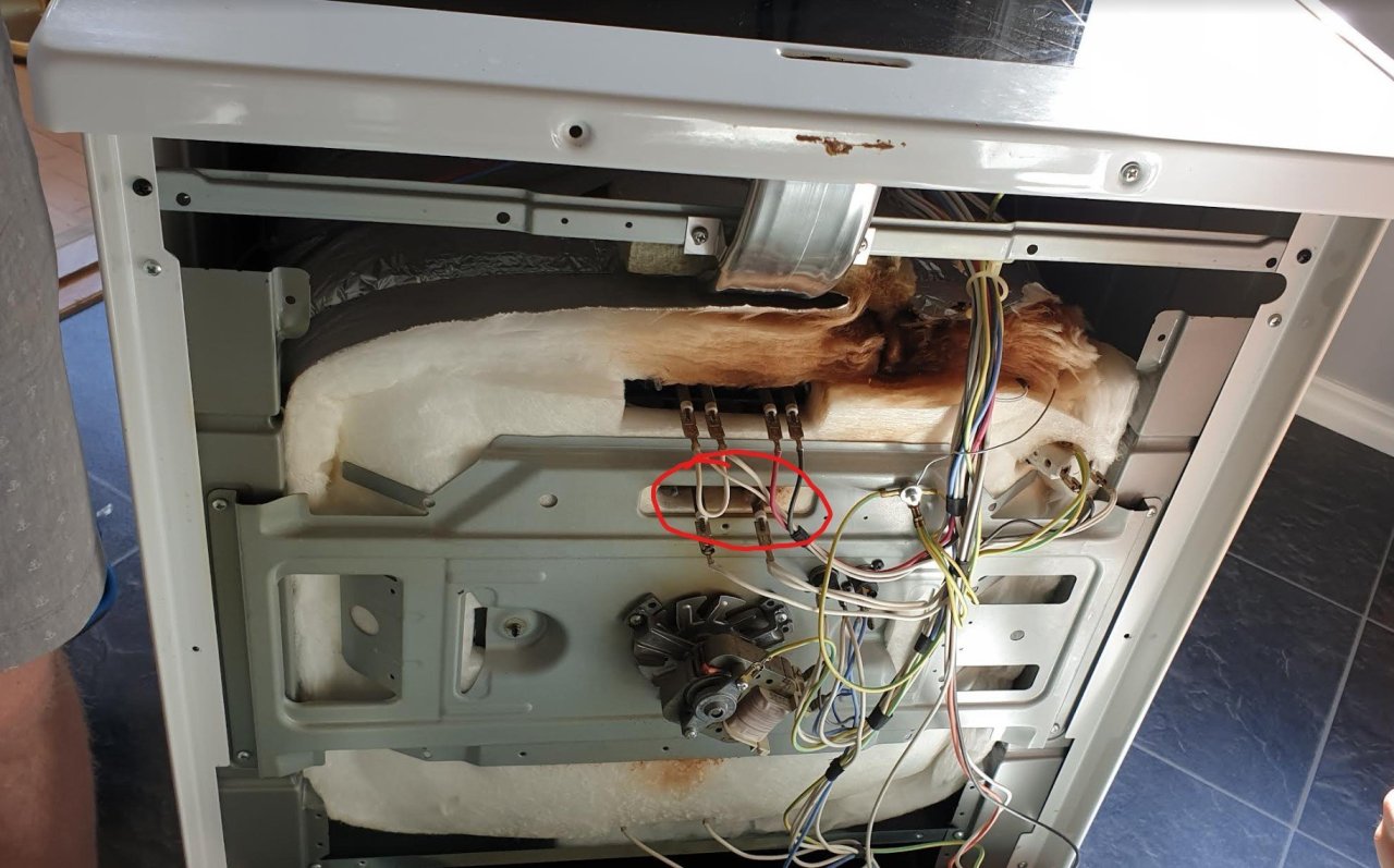 Fant et bilde av baksiden på ovnen etter at jeg tok av dekselet. Her kan du se ledninger og isolasjon. Det jeg gjorde var å løsne ledningene og skru løs elementet fra innsiden av ovnsrommet. Deretter motsatt rekkefølge med nytt element.