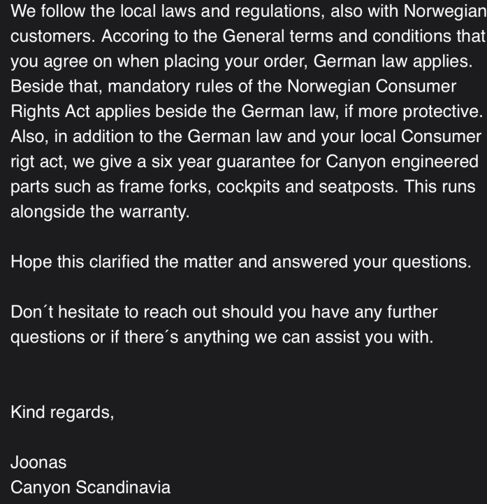 10. Hei! Gjelder norsk forbrukerrett på kjøp fra nettsider som selger produkter til Norge? Regner med det må være en "norsk" nettbuikk, men hva er definisjonen på en "norsk" nettbutikk? Det gjelder spesifikt https://www.canyon.com/no-no/. Nettsiden er (oversatt til) norsk. Canyon er vel tysk, men blir dette allikevel en nettbutikk bundet av norsk forbrukerrett? Si gjerne litt om reglene som gjelder her. https://www.canyon.com/en-no/customer-service/repair-spares-warranty/warranty-guarantee.html