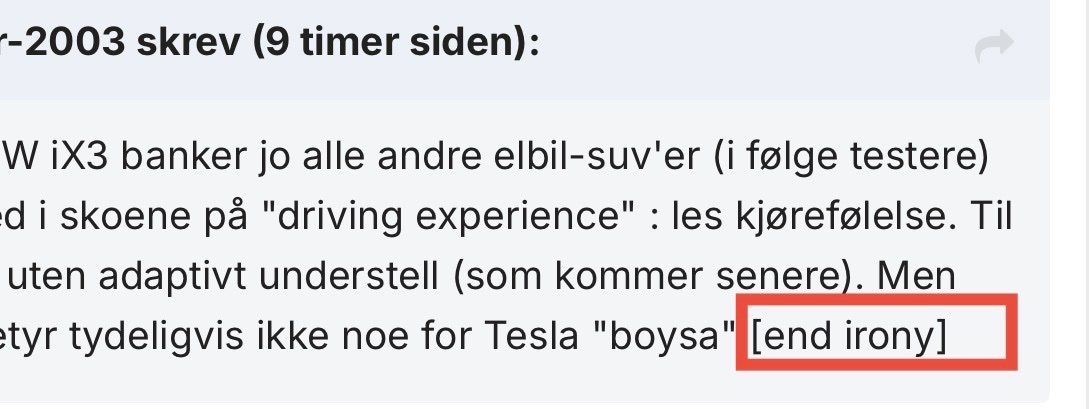 Nye BMW iX3 banker jo alle andre elbil-suv'er (i følge testere) langt ned i skoene på "driving experience" : les kjørefølelse. Til og med uten adaptivt understell (som kommer senere). Men dette betyr tydeligvis ikke noe for Tesla "boysa" [end irony]