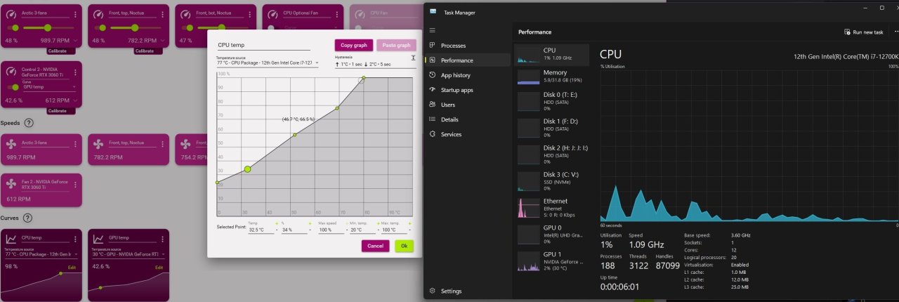 Altså, her er målene... Jeg vet ikke hva mer jeg kan gjøre... Det må være noe med at CPU'en er fail ellerno? Som om ikke det er nok, så hører jeg væske "flyte" rundt i AIO.... Det skal vel ikke være sånn? Så da er det kanskje ALFII som er gåen, hva? Her har dere lydklipp (crank up volumen for å høre lyden): https://streamable.com/e1pw09 Og her er hva task manager og fancontrol har å si: