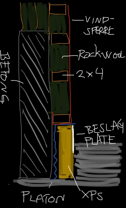 • Hvordan bør jeg gjøre overgang XPS til stender/leker utenpå betongmuren? Har tenkt på å brette knotteplast ut over topp XPS (for å slippe ut damp/fukt), for så å legge 2x4 inntil knotteplasten. Fester en remse vindsperre fra bakside 2x4 til forsiden for å kunne tape tett senere. Blir dette bra, med tanke på fukt/damp som kommer bak knotteplasten?