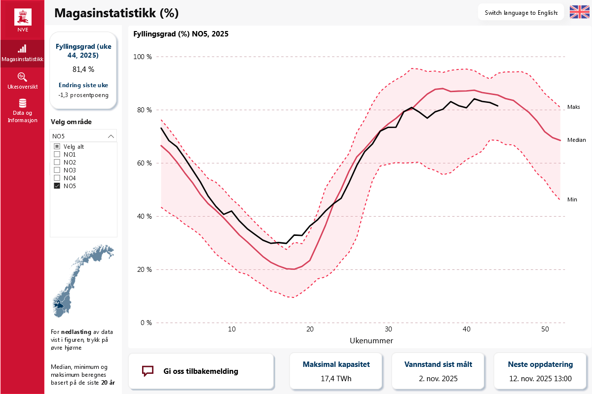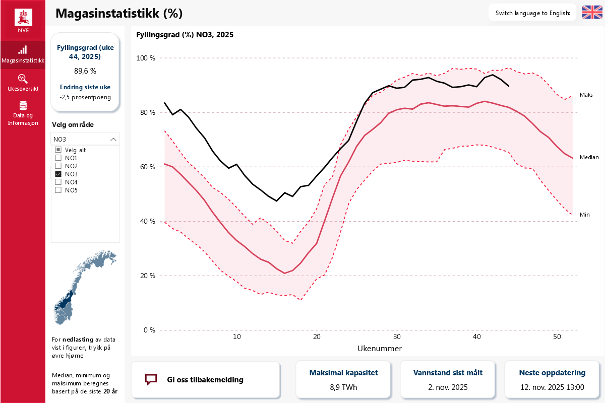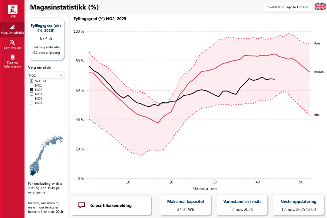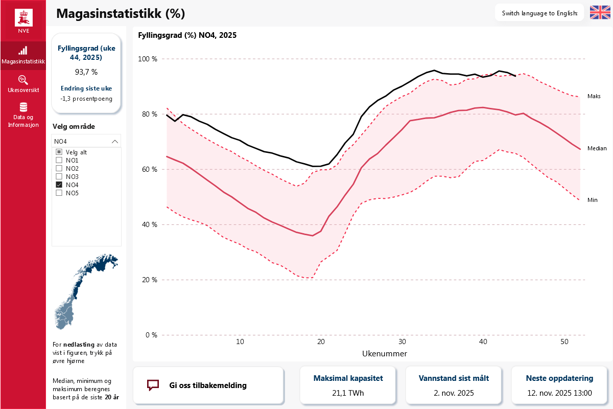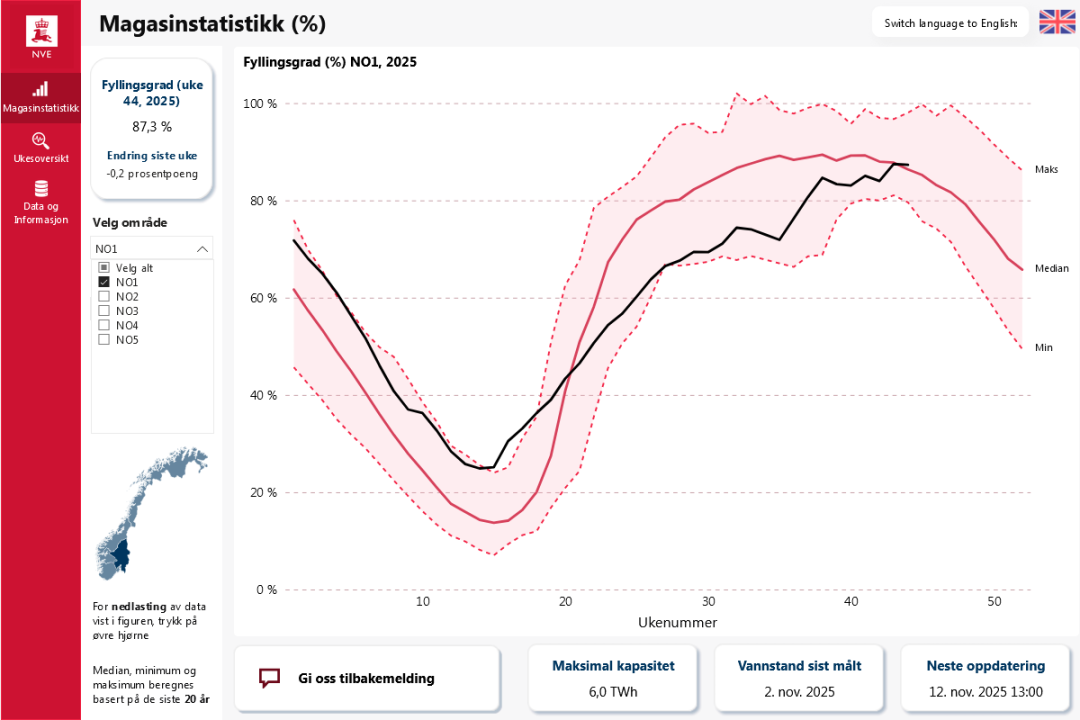 Se der ja! NO1: Vipper over median fyllingsgrad. Fin balanse mellom energi på lager og flomfare. NO2: Omtrent status quo. Litt mindre enn normalt med energi på lager, men til gjengjeld lav flomfare. Ulempen er litt høye priser, fordelen flomfare. NO3: Mye energi på lager, litt redusert flomfare. Fin tilstand. NO4: Svært mye energi på lager, høy flomfare. Et kobbel av negative konsekvenser. NO5: Mye energi på lager, litt redusert flomfare. Fin tilstand. -
