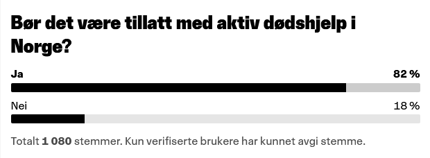 Nettavisen norsk debatt: Aktiv dødshjelp - Jeg vil velge min egen død Blir jeg dødelig syk, vil jeg selv ha muligheten til å avslutte det mens min bevissthet er intakt. Spørreundersøkelsen viser: