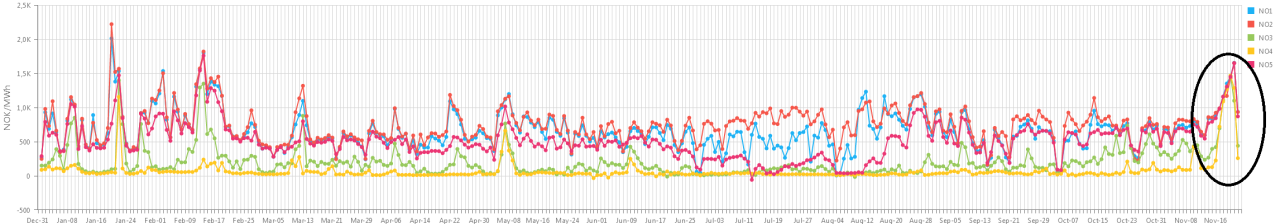 Det ser ut til at jeg traff spikeren på hodet der. Prisene faller kraftig allerede lørdag. Nord-Norge er tilbake på en snitt spotpris rundt 25 øre og midt-norge rundt 45 øre. Sør-Norge er rett under kronestykket men husholdninger får ytterligere drahjelp nedover uansett hvilken strømstøtteordning de har. NO1 fredag 166 øre, lørdag ca 90 øre NO2 fredag 165 øre, lørdag ca 90 øre NO3 fredag 101 øre, lørdag ca 45 øre NO4 fredag 129 øre, lørdag ca 25 øre NO5 fredag 165 øre, lørdag ca 85 øre Uthevede priser kvalifiserer for strømstøtte -