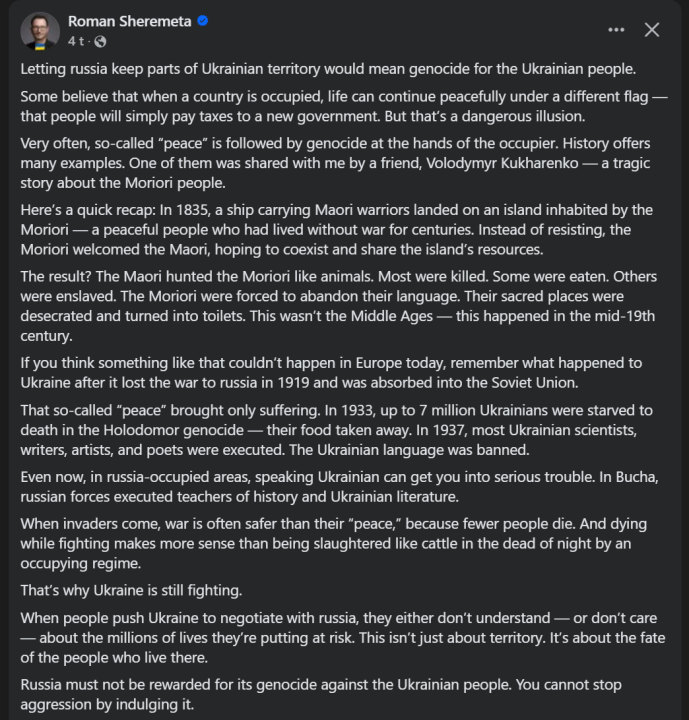Ukrainerne vet at det står mellom folkemord eller å kjempe videre. Det er mye mer konstruktivt å kjempe videre "til siste Ukrainer" enn å tillate folkemord uten motstand. Et folkemord vil koste adskillig flere liv. Les denne til du forstår Ukrainerne selv: -