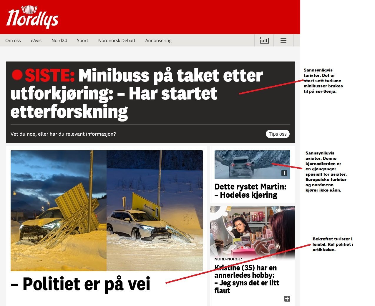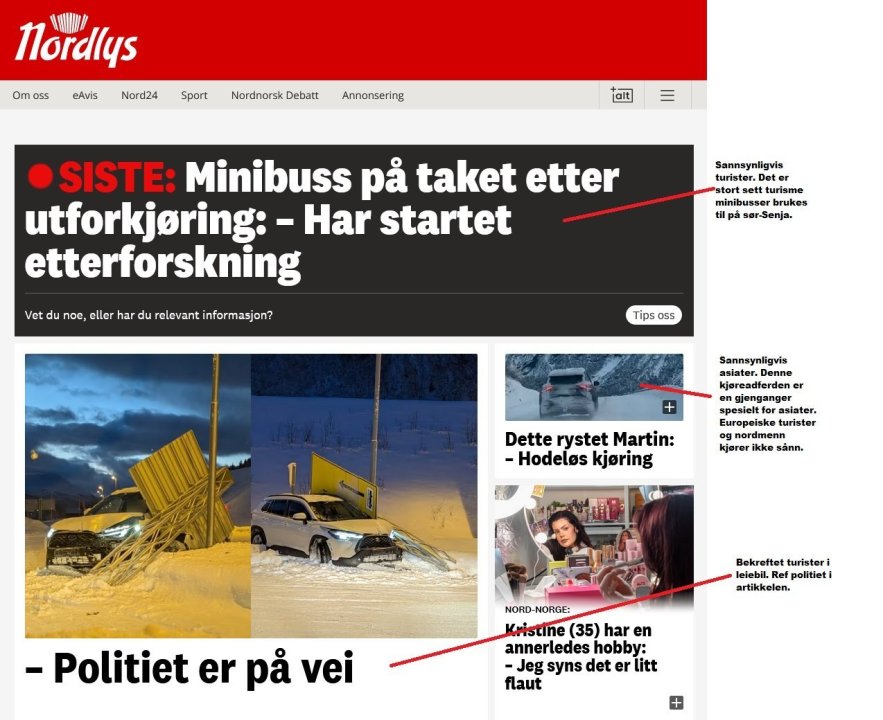 Forsiden til Nordlys akkurat nå, med mine kommentarer: Etter å ha kikket nærmere på bildene fra trafikkulykkene i går: - Buss i grøft på Fagereng: Sannsynligvis en av sjåførene uten opprinnelse i Tromsø/Norge. - Buss skled baklengs ned bakke i sentrum: Sannsynligvis det samme. Busselskapet sliter med rekruttering og deler seg i stort sett to grupper: Eldre nordmenn med lang erfaring som sjåfør i Tromsø. Disse havner sjeldent i uhell pga føre. Den andre gruppen er yngre og ofte av utenlandsk opprinnelse. Ofte med relativt ferskt førerkort på buss. - Bobil skled baklengs ned mackbratta: Utenlandske skilter - Grå varebil skled baklengs ned samme sted: Også her utenlandske skilter - Grøholdtbakken: Sort minibuss fra Tromsø taxi: Godt mulig en sjåfør med utenlandsk opprinnelse her også - Grøholdtbakken, blå taxi: Godt mulig utenlandsk opprinnelse her også - Grøholdtbakken, hvit taxi: Samme her. - Tre andre biler var involvert i Grøholdtbakken, ukjent opprinnelse på sjåførene. Ser ut som lokalt tilhørende biler som har blitt innblandet. - Kollisjon mellom to biler i Finnfjordbotn: Ukjent - Kollisjon i Ramfjorden: En blå Toyota merket Hertz kolliderte med motgående kjøretøy, så kan man jo tenke seg til om det var ekte tromsøværinger eller ikke inni den. - Kjedekollisjon i Arbeiderbakken: Ukjent, men ser ikke ut som leiebiler (dårlig bilde i mørket)