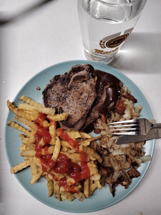 I dag ble det biff, løk, sopp, pommes fritz og brun saus. Ikke veldig sunt, men det kunne vært verre. Antydning til rosa inni, så jeg kunne godt tatt den av litt tidligere. Jeg liker den medium.